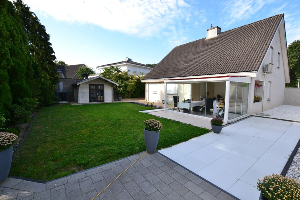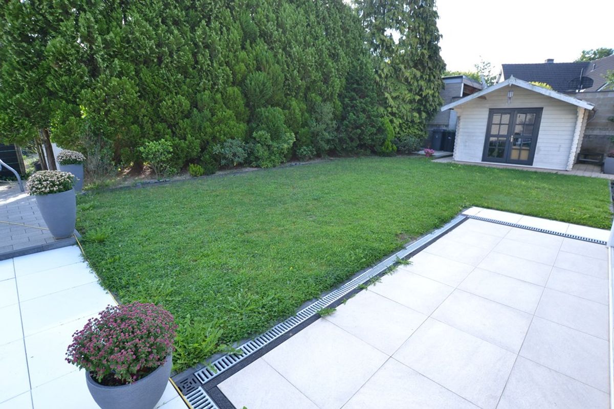 Achtertuin met ruime luxe serre, nieuwe bestrating, gazon, beplanting, muren, siergrind, houten tuinhuisje 3,55 x 2,75, tweede terras met voorbereiding om buitensauna met krachtstroom (twee groepen) te realiseren.