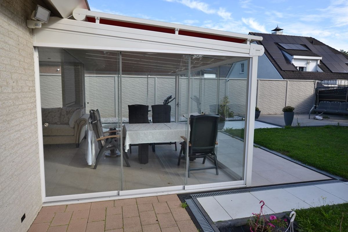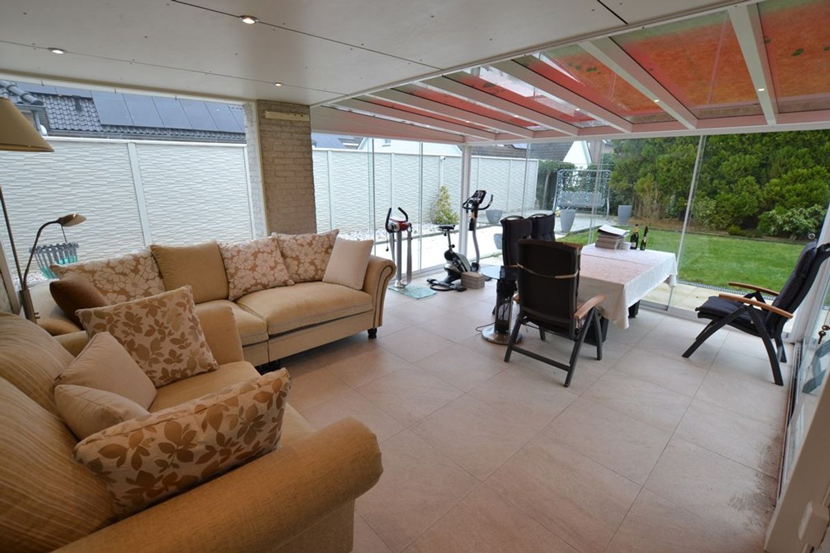 Hoogwaardige serre 5,50 x 4,20 met keramische geïsoleerde tegelvloer, LED-inbouwspots, 10 glazen schuifdeuren, elektrisch bedienbare zonwering en airco.