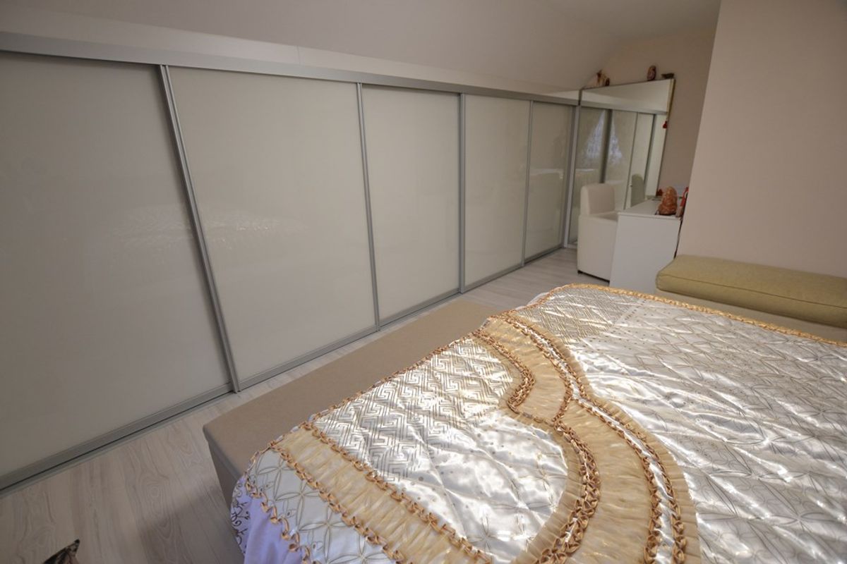 Slaapkamer 1: 5,75/4,45 x 4,10 met laminaatvloer en luxe ingebouwde kastenwand.