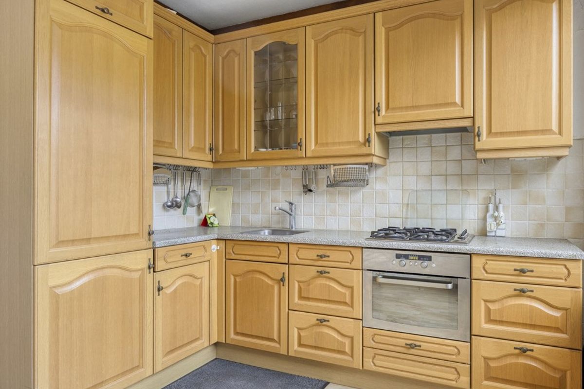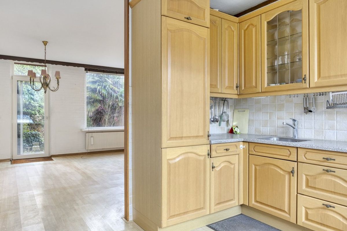 Aan de voorzijde ligt de halfopen, functionele keuken. Aan de achterzijde geven de tuindeur en het grote raam uitzicht op de diepe, zonnige tuin. Zie jij hier al voor je hoe het wordt na een kleine verbouwing of een nieuwe keuken?