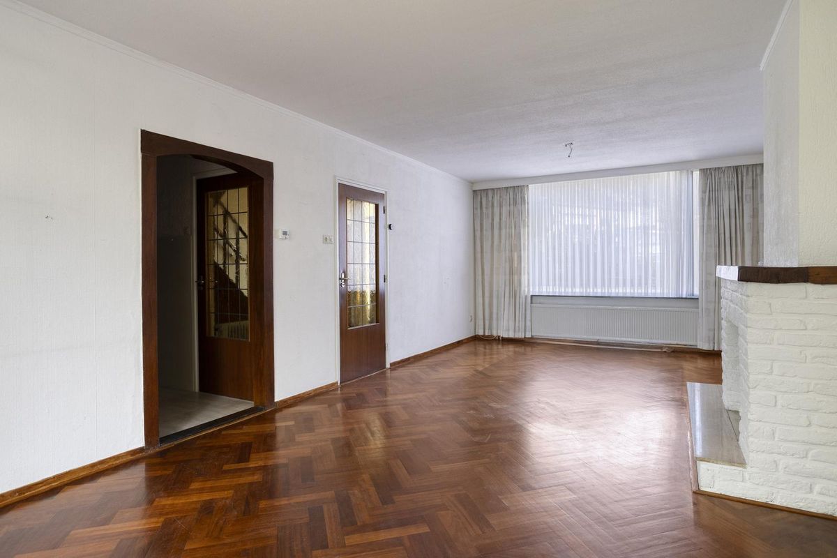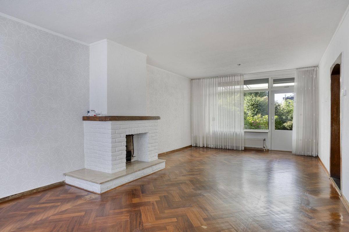 De lichte en sfeervolle woon-/eetkamer beschikt over grote ramen aan zowel de voor- als achterzijde en een schouw met open haard. Aan de achterzijde zijn rolluiken aanwezig.
