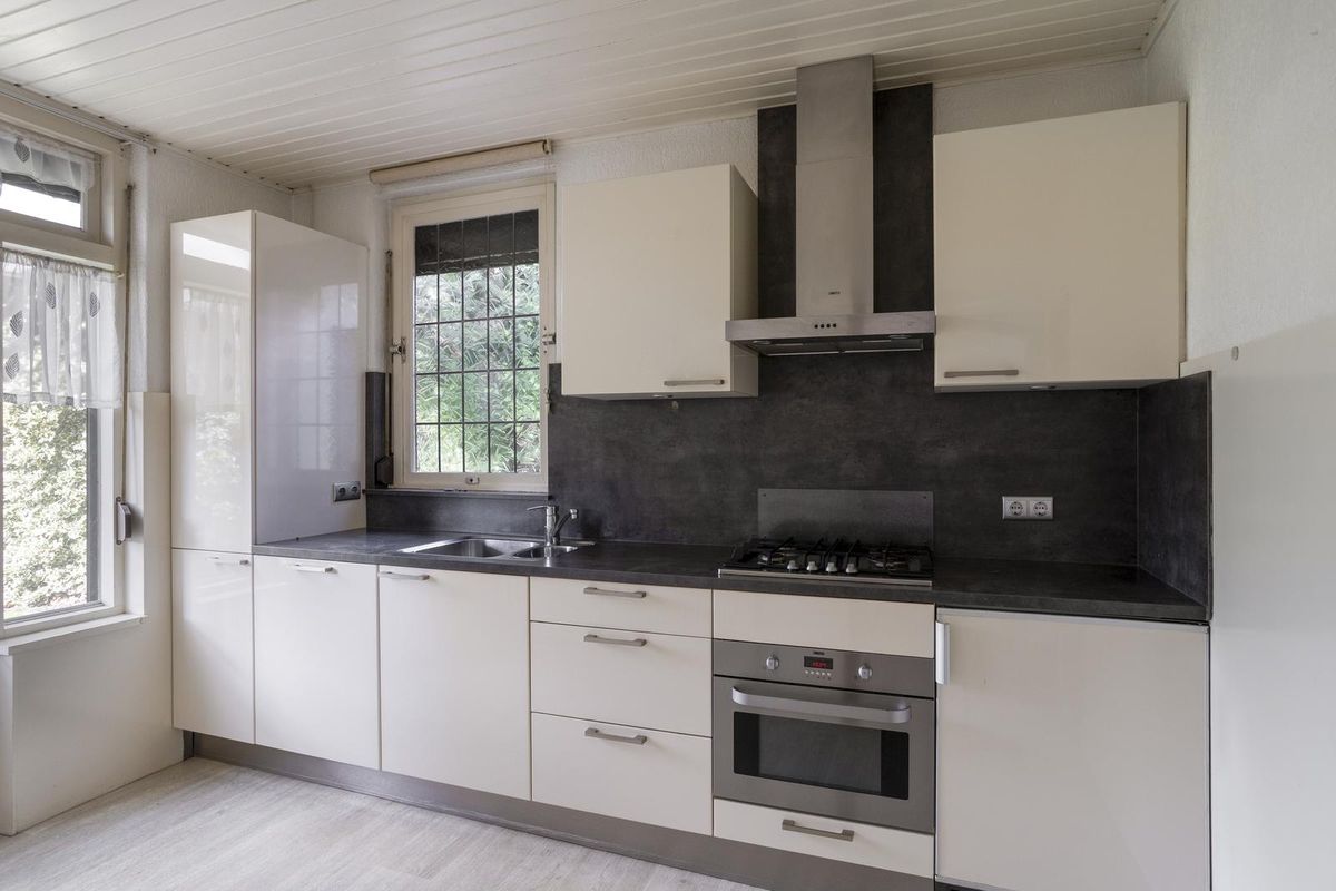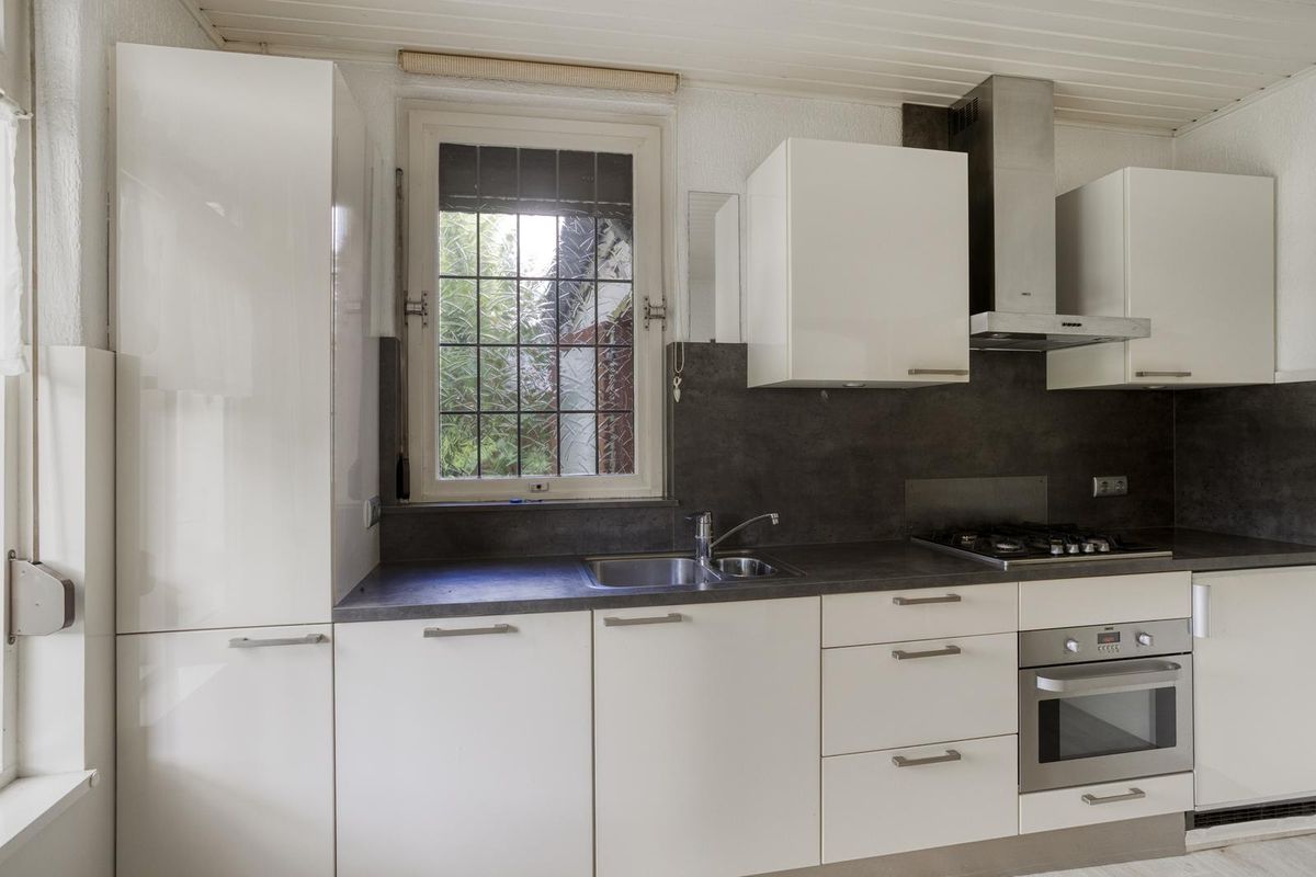 De keuken is netjes ingericht met boven- en onderkasten en voorzien van diverse inbouwapparatuur, waaronder een vierpits gaskookplaat met roestvrijstalen afzuigkap, oven, vaatwasser en koelkast. Het kunststof werkblad beschikt over een roestvrijstalen spoelbak. Vanuit de keuken is via een openslaande deur de tuin bereikbaar. Ook hier zijn rolluiken aanwezig.