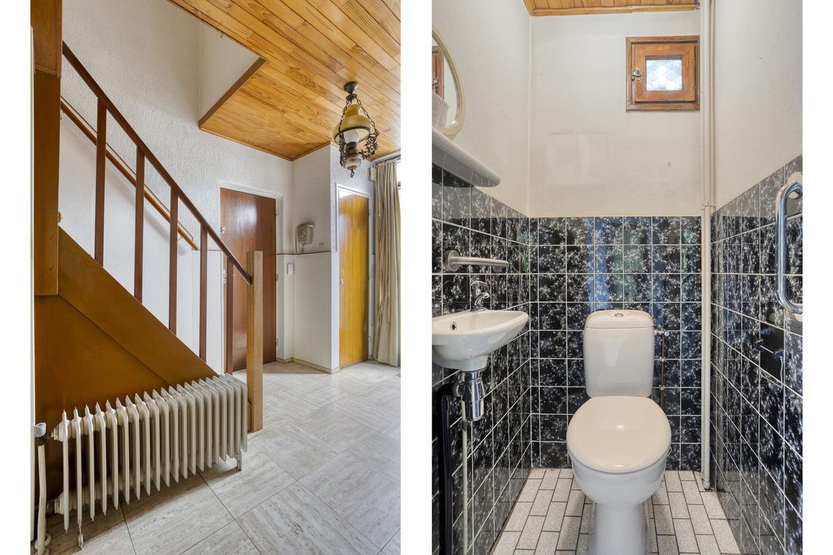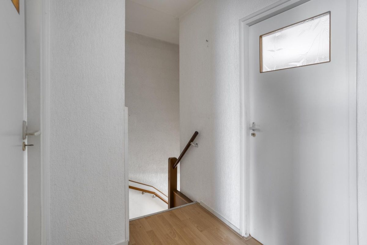 Entree met toegang tot de toiletruimte, woon-/eetkamer, keuken, trapkast, meterkast en garage. De toiletruimte is half betegeld en voorzien van een duoblok en fonteintje.