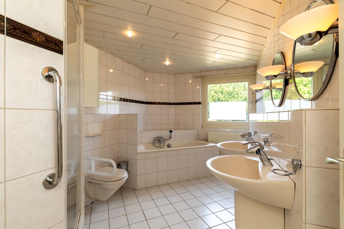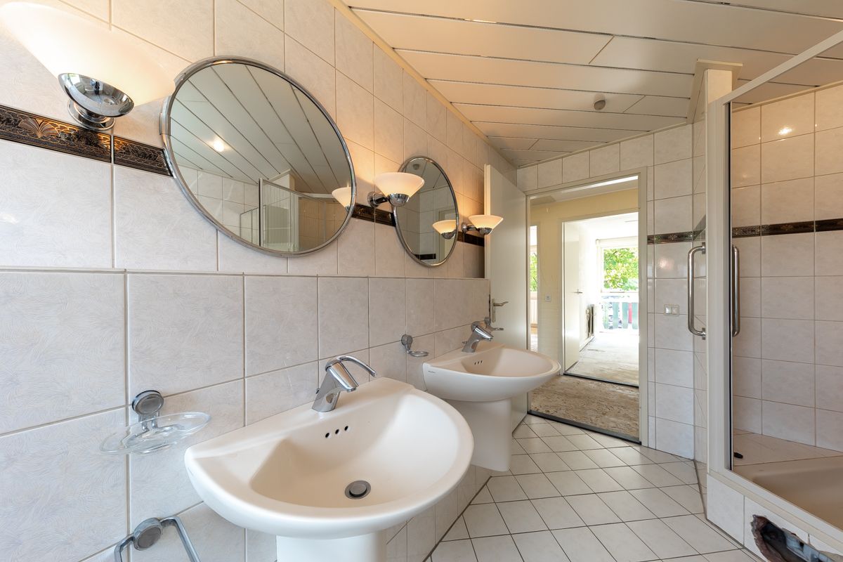 - Badkamer met bad, douche, toilet en dubbele wastafel