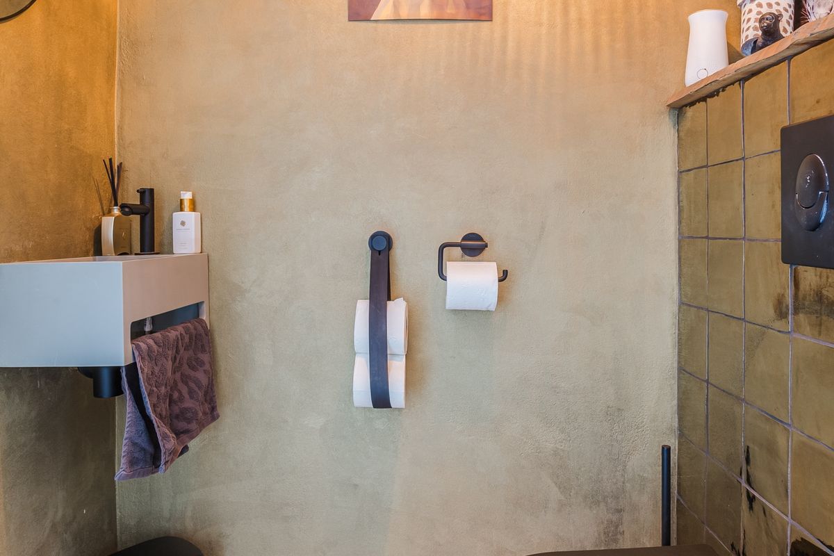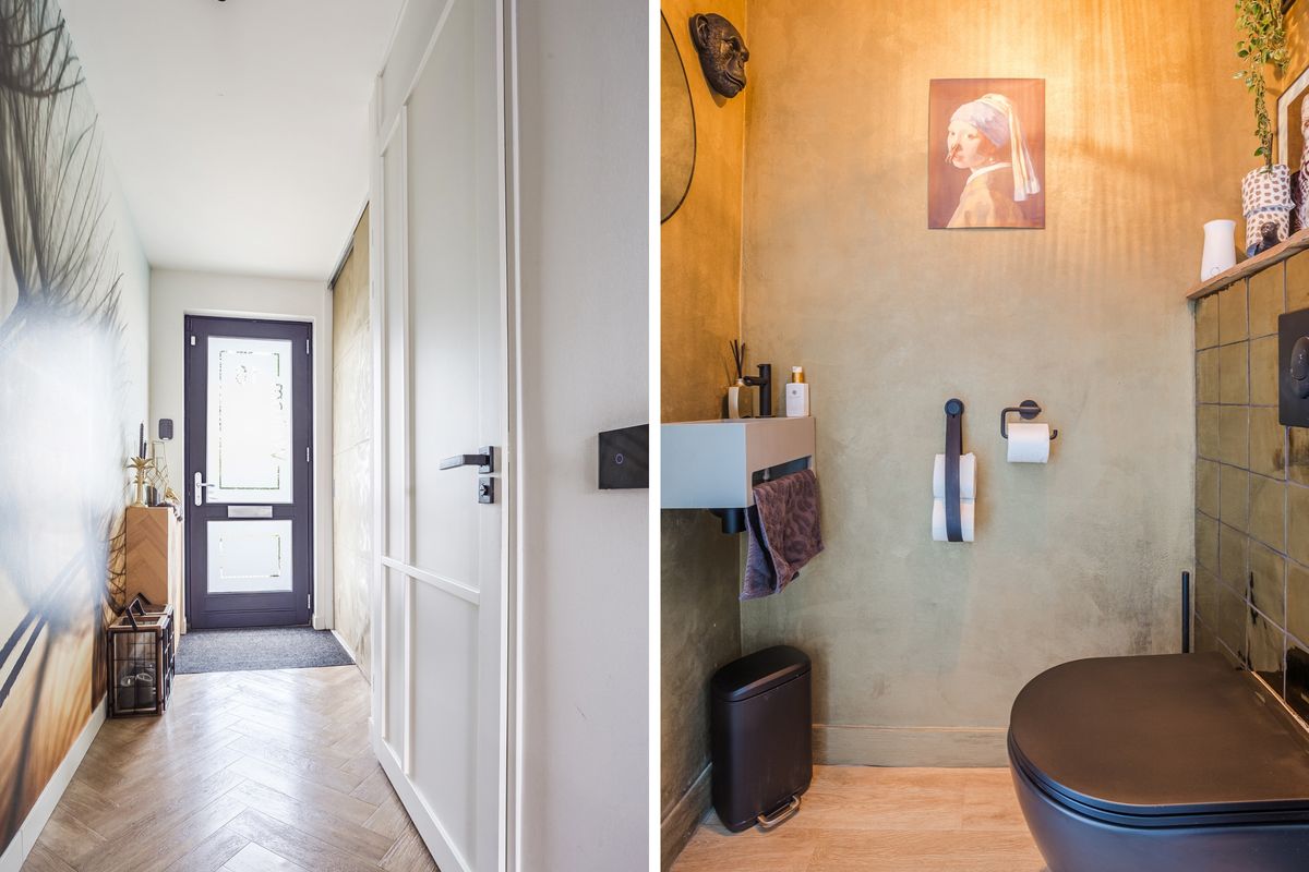 Hier vind je links achtereenvolgens een op maat gemaakte inbouwkast, een separate toiletruimte (met vrij hangend toilet en fonteintje) en de trapopgang.