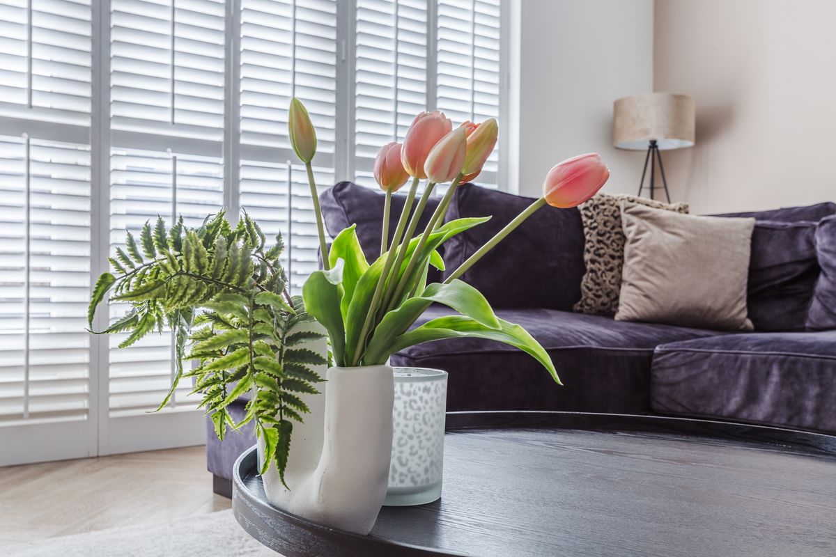 Los daarvan gaat het hier om een sfeervolle woonkamer met grote ramen die uitzicht bieden over de achtertuin.