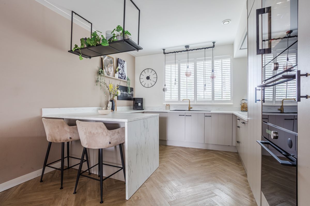 Richting de voorkant van deze woonlaag vind je een moderne ogende keuken, die dankzij de ecrukleurige fronten en het witte aanrechtblad bijzonder rustgevend oogt.