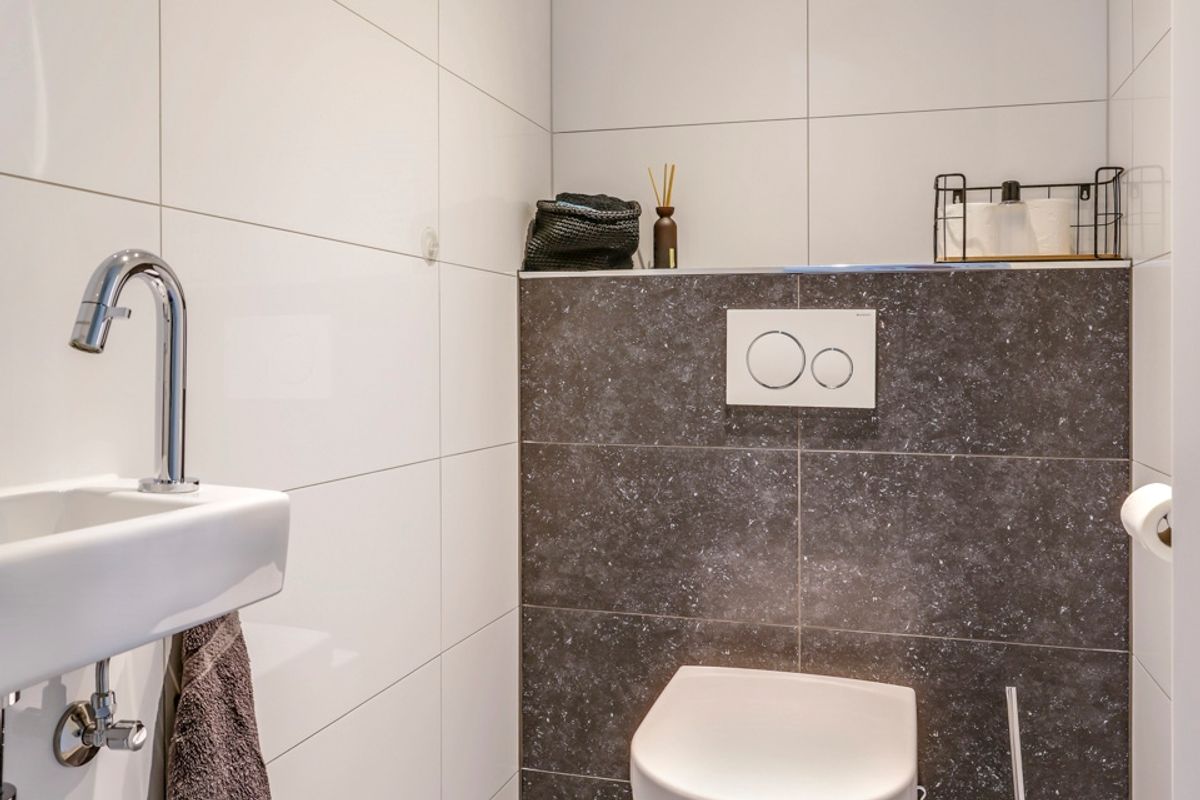 Je betreedt de woning via de smaakvol aangelegde voortuin met eigen oprit. In de hal vind je het moderne toilet met fonteintje en de garderobe.
