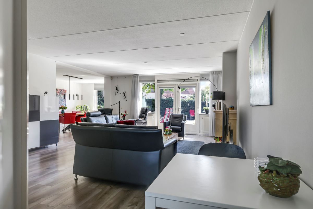 De woonkamer is heerlijk licht dankzij de grote ramen en openslaande tuindeuren. Het tuincontact is fantastisch: zowel via het uitzicht als de directe toegang naar buiten. Blikvanger is de natuurstenen schouw, die de ruimte karakter geeft. De laminaatvloer en de hoogwaardige afwerking maken het geheel strak en stijlvol.