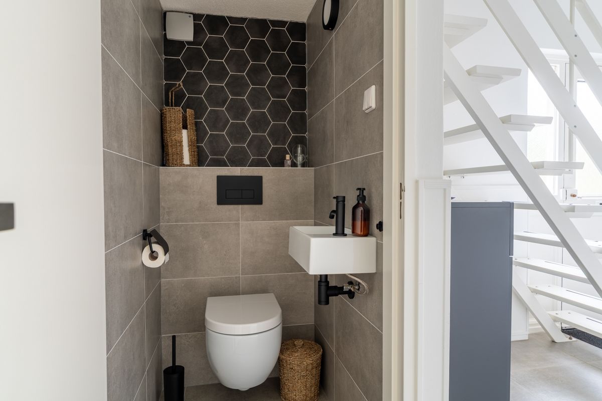 De badkamer, vernieuwd in 2022, voelt fris en modern aan. Strakke grijze tegels, een stijlvol wastafelmeubel en een toilet maken van deze ruimte een fijne plek om je dag te beginnen of juist rustig af te sluiten.