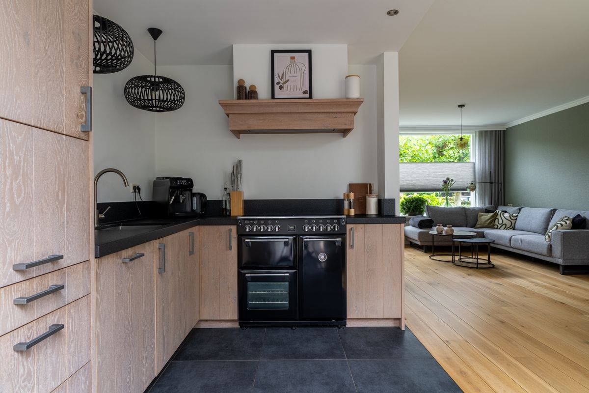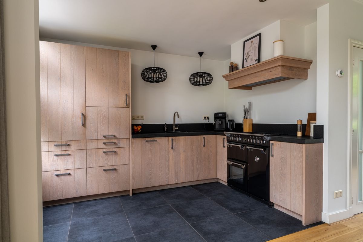 De keuken sluit naadloos aan op de woonkamer en is werkelijk een plaatje. Uitgevoerd in een moderne hoekopstelling, met fronten in eikenfineer die een warme en luxe uitstraling geven. Alles wat je nodig hebt is aanwezig: een royale koelkast, een fornuis met niet één maar twee ovens én een grill, een stijlvolle afzuigkap en natuurlijk een vaatwasser. Met zo’n keuken wordt koken geen klus, maar een feestje. En dat feestje gaat moeiteloos over in dineren, want de openslaande deuren brengen je zo van de keuken naar de tuin.
