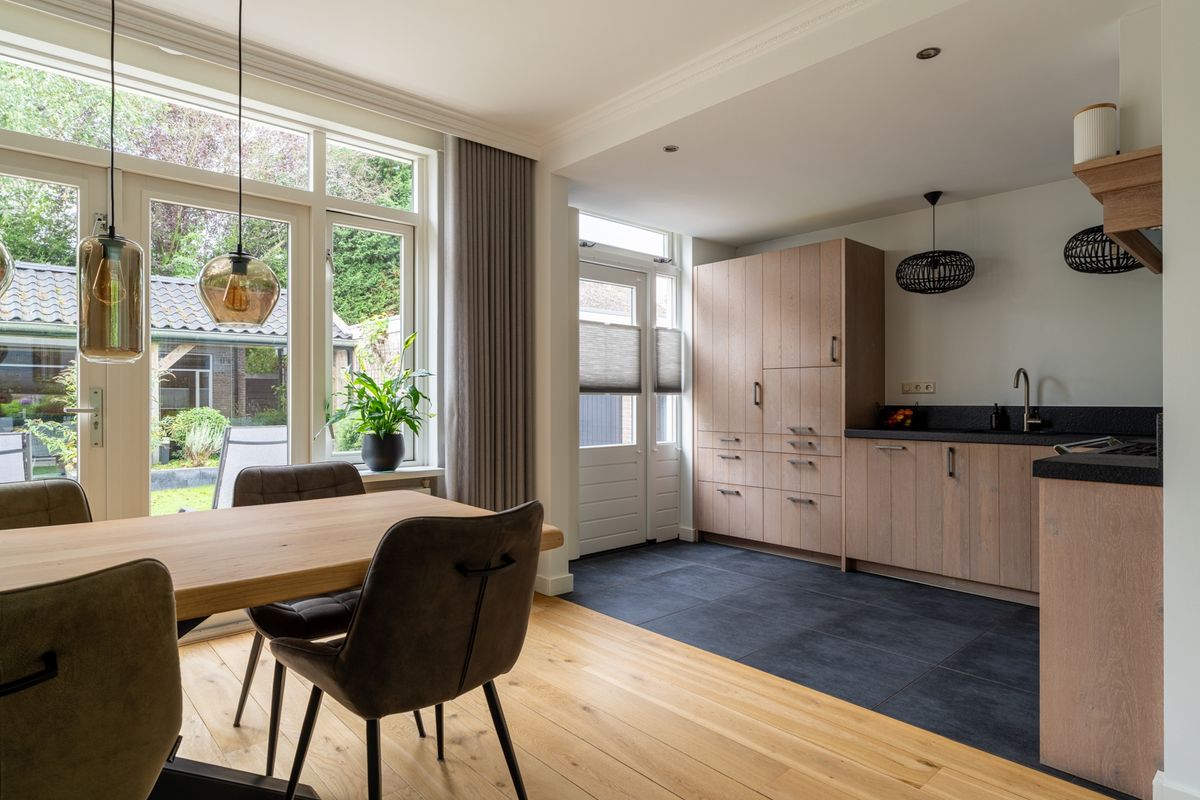 Binnenkomen doe je hier in stijl. De woonkamer is licht en uitnodigend dankzij de grote ramen en de openslaande tuindeuren naar de tuin. Zodra de zon schijnt, dansen de lichtstralen over de eikenhouten vloer – een vloer die niet alleen warmte en luxe uitstraalt, maar ook tijdloos is. Het is de ideale plek voor lange filmavonden, gezellige borrels of gewoon lekker met een boek op de bank.