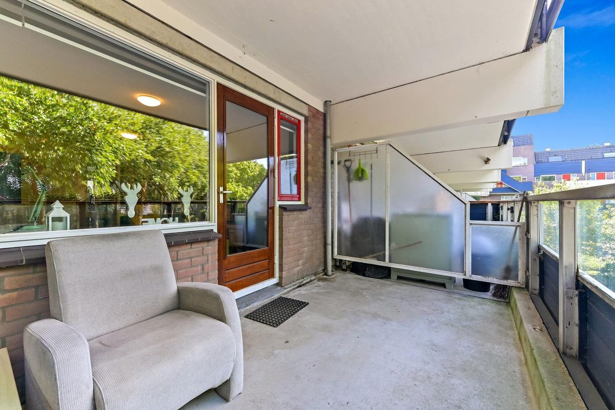 Het terras is ruim van opzet, gelegen op het westen en biedt een vrij uitzicht op de groene woonomgeving.