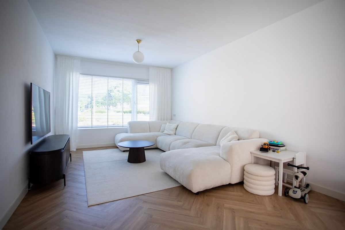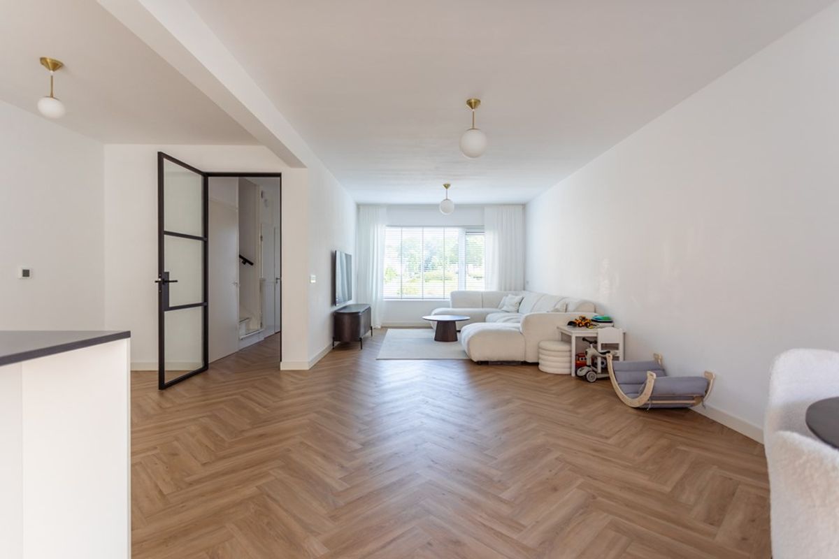 De lichte, ruime woonkamer is voorzien van vloerverwarming en grote raampartijen die zorgen voor veel daglicht en een prettig uitzicht op de tuin.