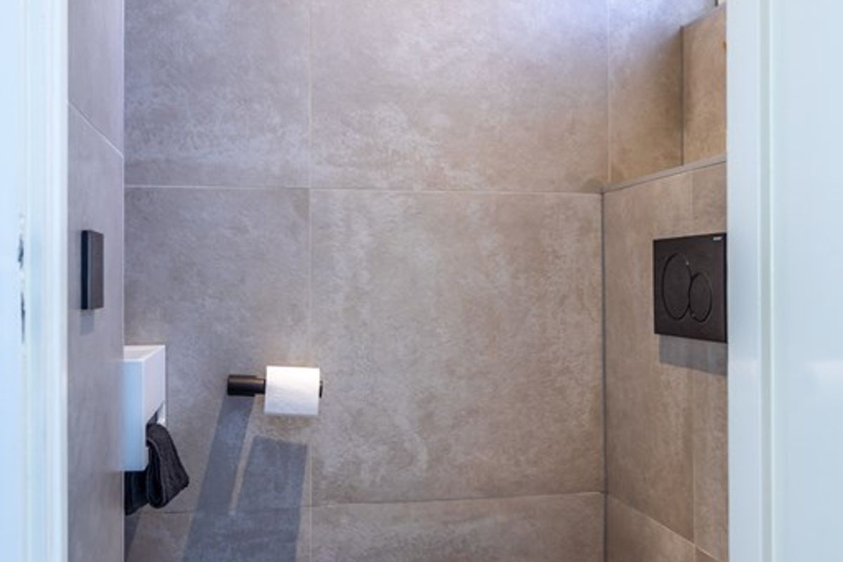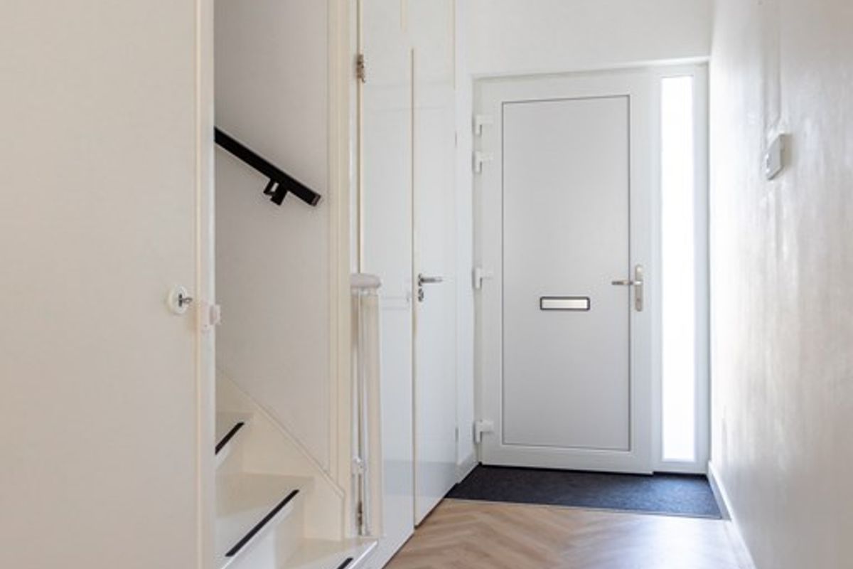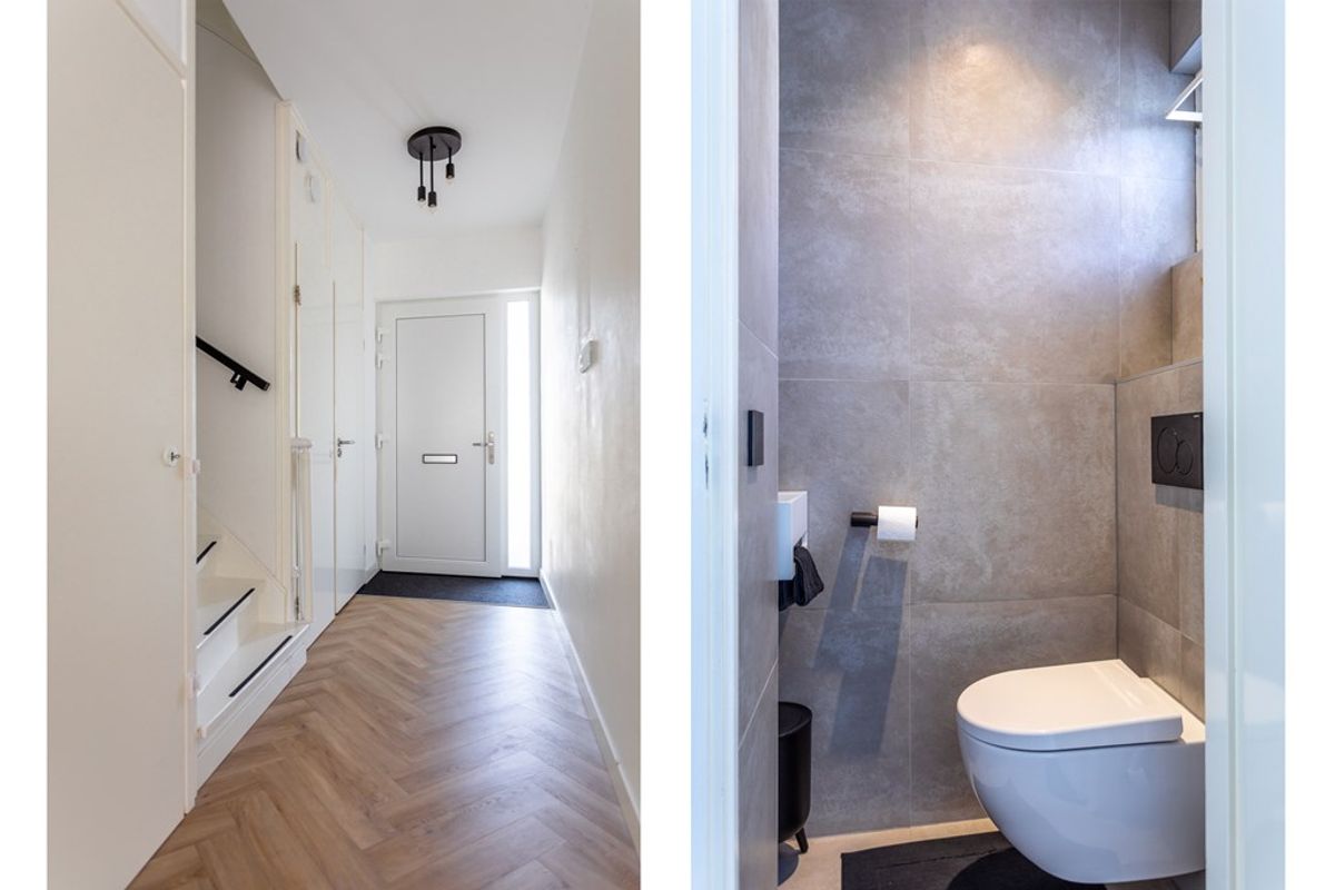 Through the well-maintained front garden (north-facing), you enter the home. The stylish herringbone-patterned PVC floor immediately stands out in the hallway and continues throughout the entire ground floor. Here you’ll find the meter cupboard, a modern toilet, the staircase, and a handy storage closet under the stairs.