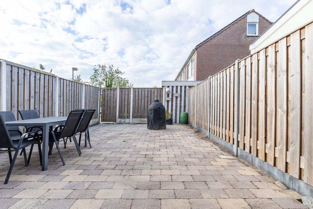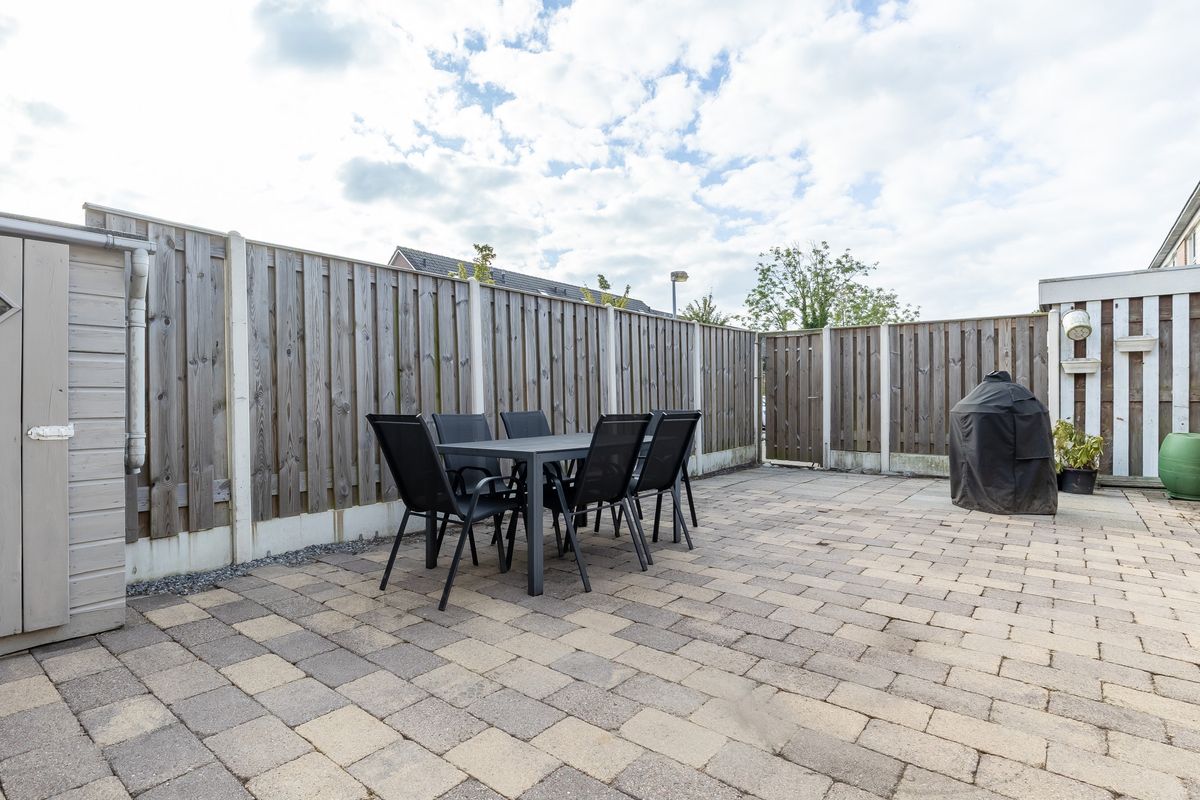 De bestraatte achtertuin is royaal, ligt gunstig op het zuiden gericht en is bovendien strak en stevig omheind met houten schuttingen op beton en aan betonpalen. Aan de achtergevel hangt een elektrisch bedienbaar zonnescherm, er is een buitenkraan aanwezig en een poort waardoor de achtertuin- en zodoende ook de woning ook achterom bereikbaar zijn.