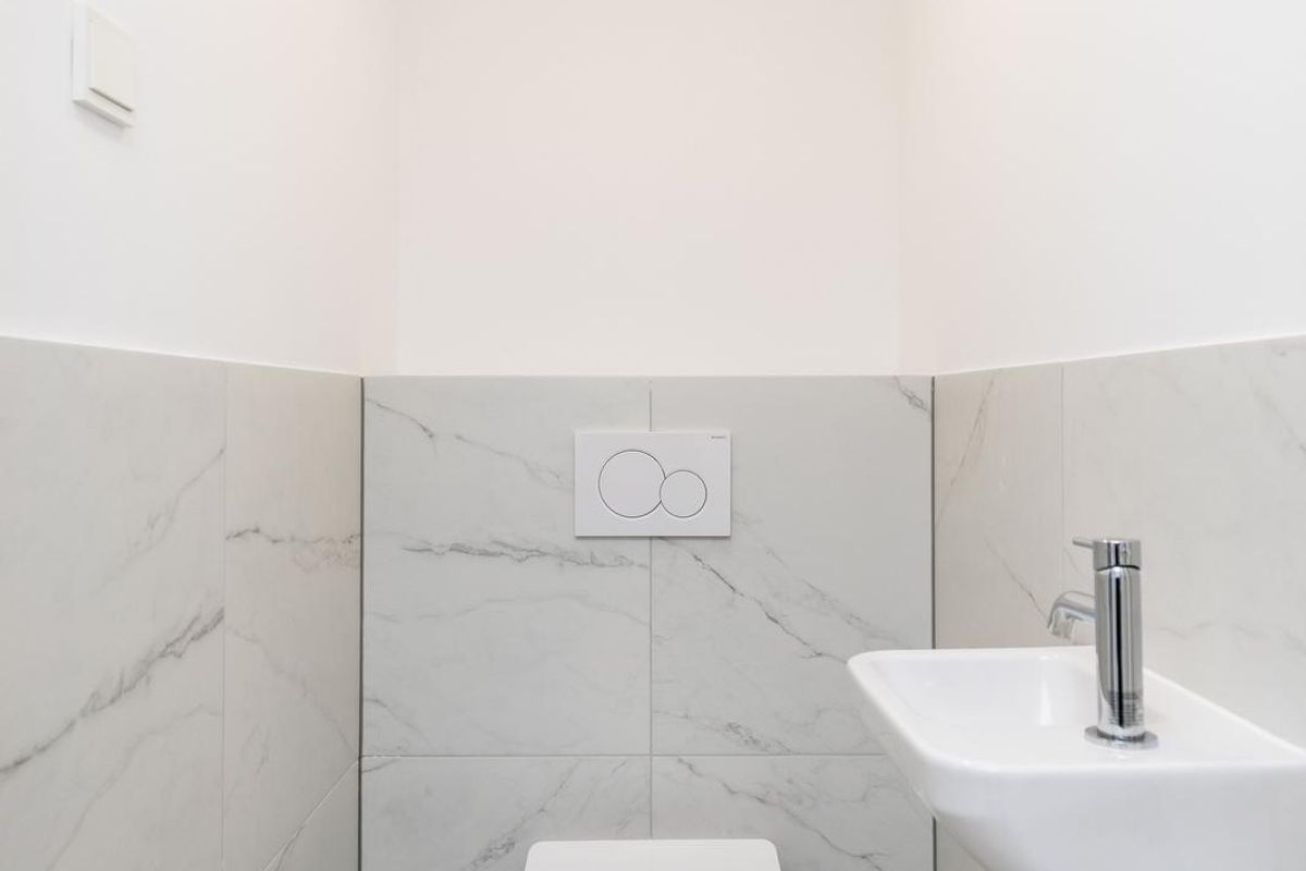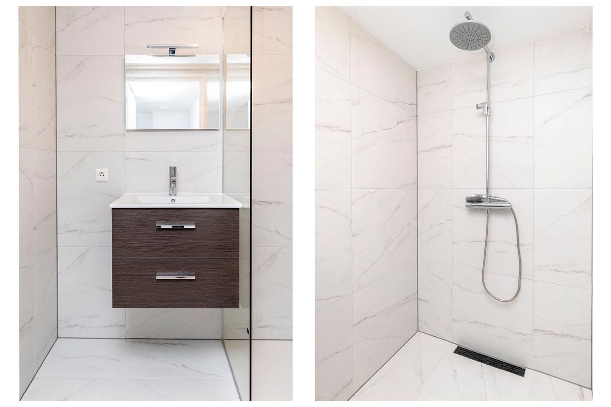 * De moderne badkamer is voorzien van marmeren tegels, inloopdouche en een wastafel;