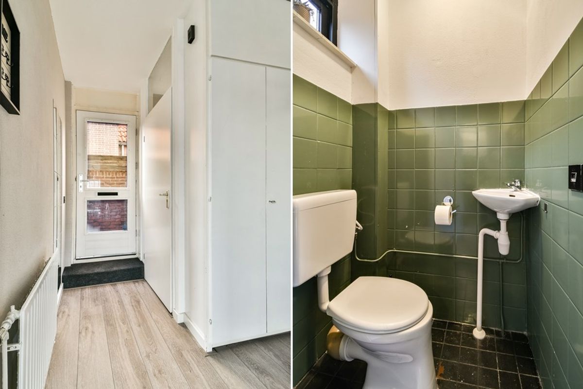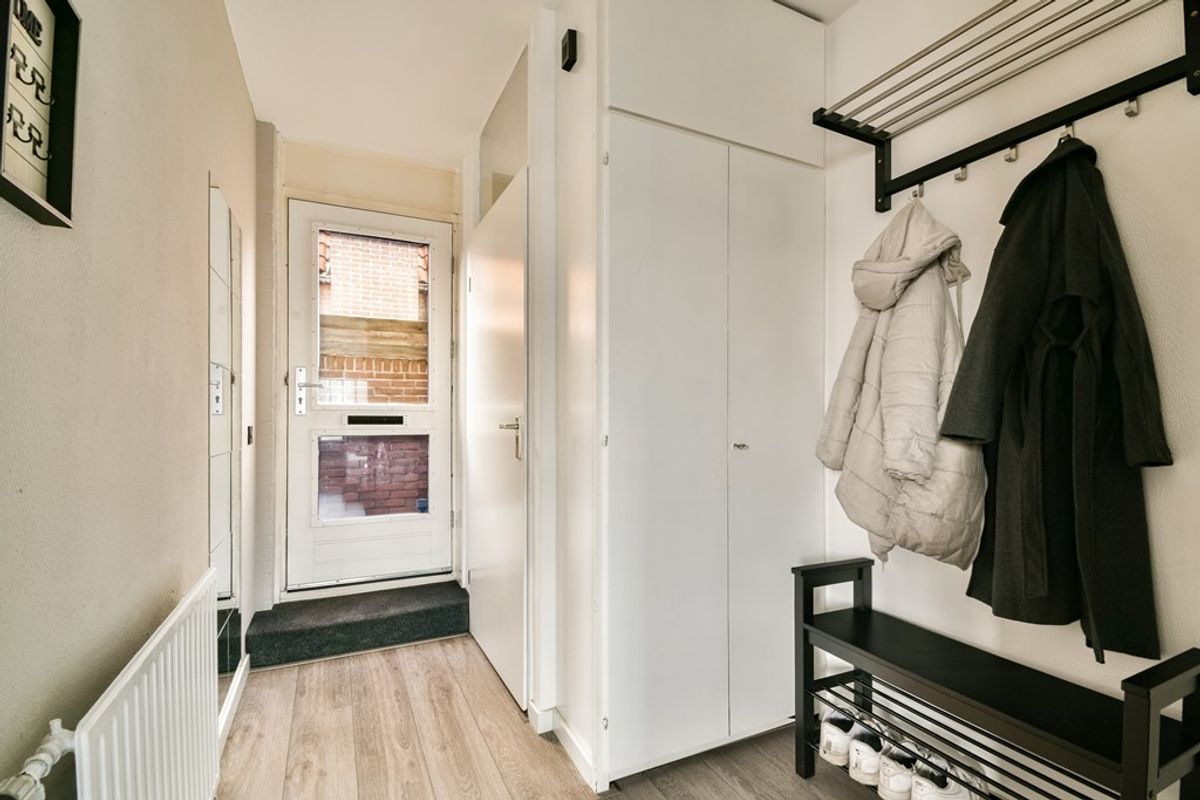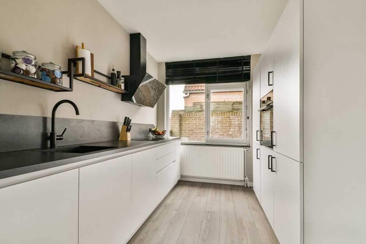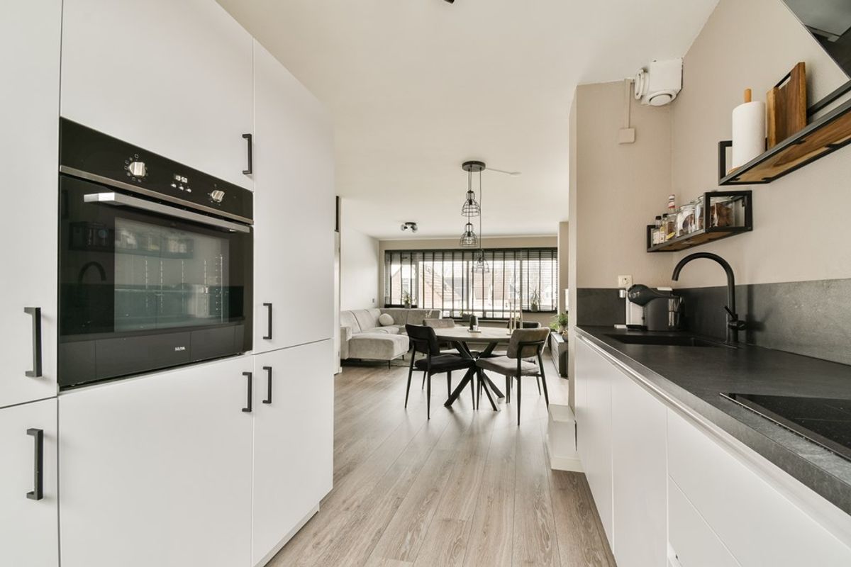 Entree in de hal met de deels betegelde toiletruimte met staand toilet en een fonteintje, de meterkast, de garderobe en de trapopgang naar 2de woonlaag. De ruime L-vormige woonkamer biedt een praktische trapkast en toegang tot het heerlijke dakterras. Door de brede raampartij geniet deze ruimte van volop daglicht. De aan de voorzijde gelegen open keuken is in 2020 geplaatst en recent voorzien van een nieuwe inductiekookplaat. Ze beschikt verder over een koel-/vriescombinatie, een oven, een vaatwasser en een design afzuigkap.