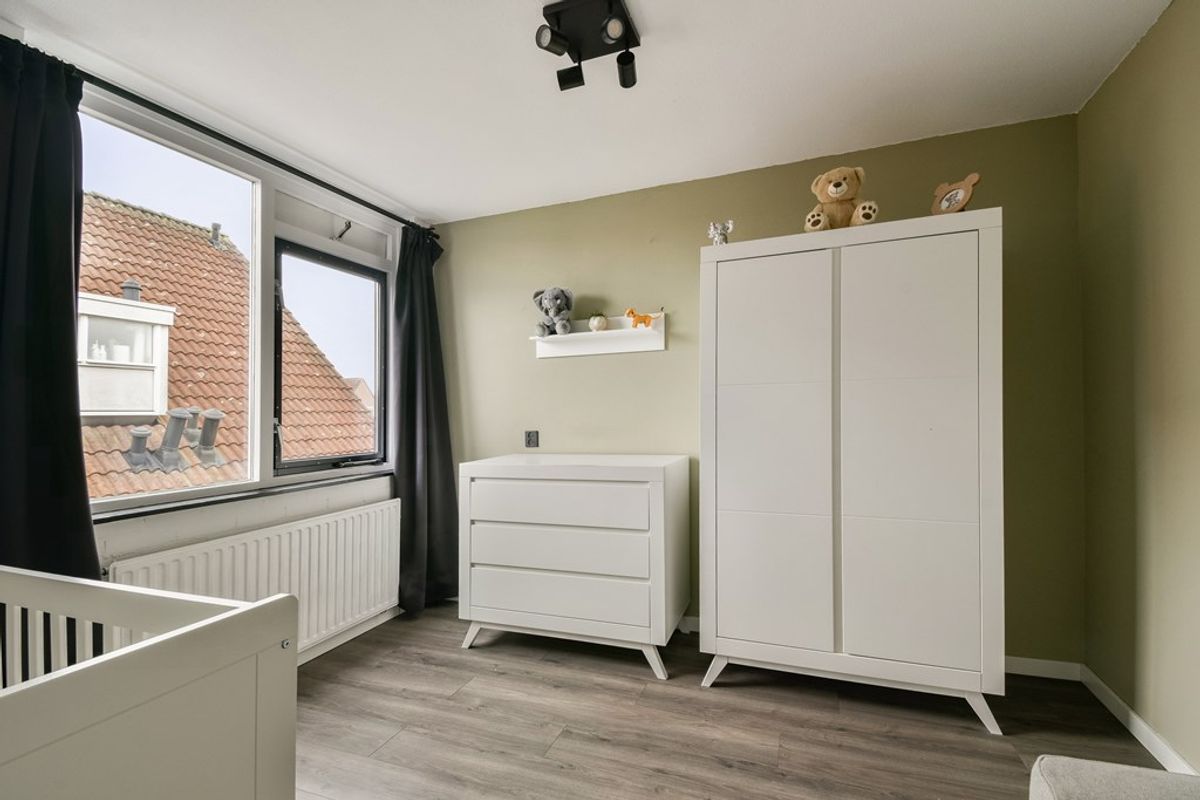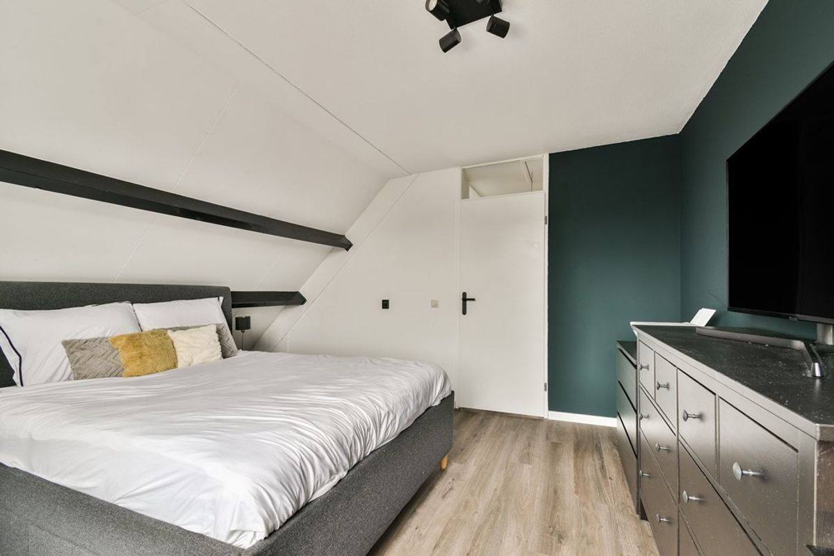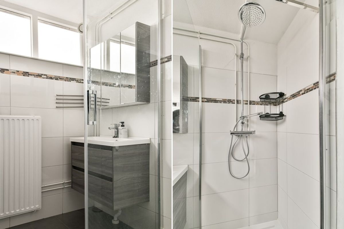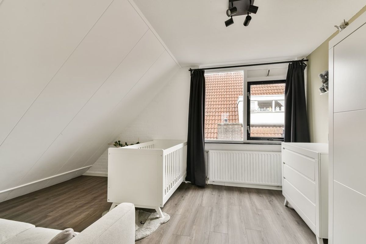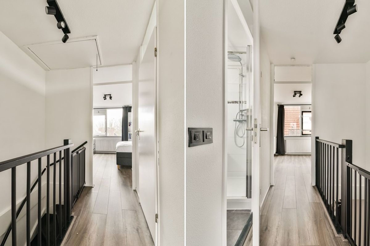 De overloop staat in directe verbinding met de badkamer en de 2 slaapkamers. Vanuit hier is d.m.v. een vlizotrap de bovengelegen zolderetage te bereiken. De eerste slaapkamer ligt aan de voorzijde en is circa 4 x × 3,35 meter. De tweede slaapkamer ligt aan de achterzijde en is circa 3,35 × 3,35 meter. De modern uitgevoerde badkamer is uitgerust met een regendouche, een wastafelmeubel, een hangend meubel, de boiler (huur) en de witgoedaansluitingen.