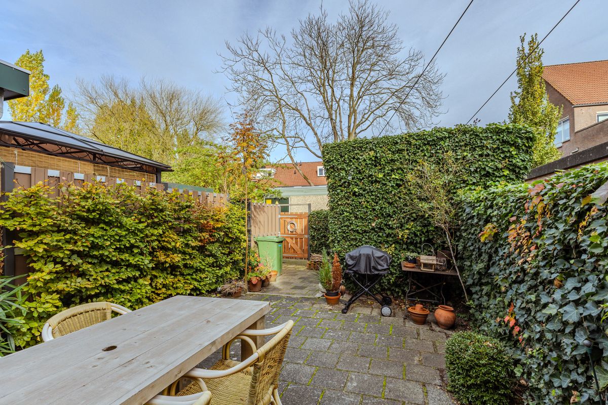 De achtertuin beschikt over een achterom en een stenen berging . Aan beide zijden zorgen groene hagen naast een prettige, natuurlijke uitstraling ook voor de gewenste privacy. Nabij de woning is een fijn zitgedeelte gecreëerd, terwijl aan de achterzijde ruimte is gereserveerd voor de containers. De overige delen van de tuin zijn netjes betegeld.