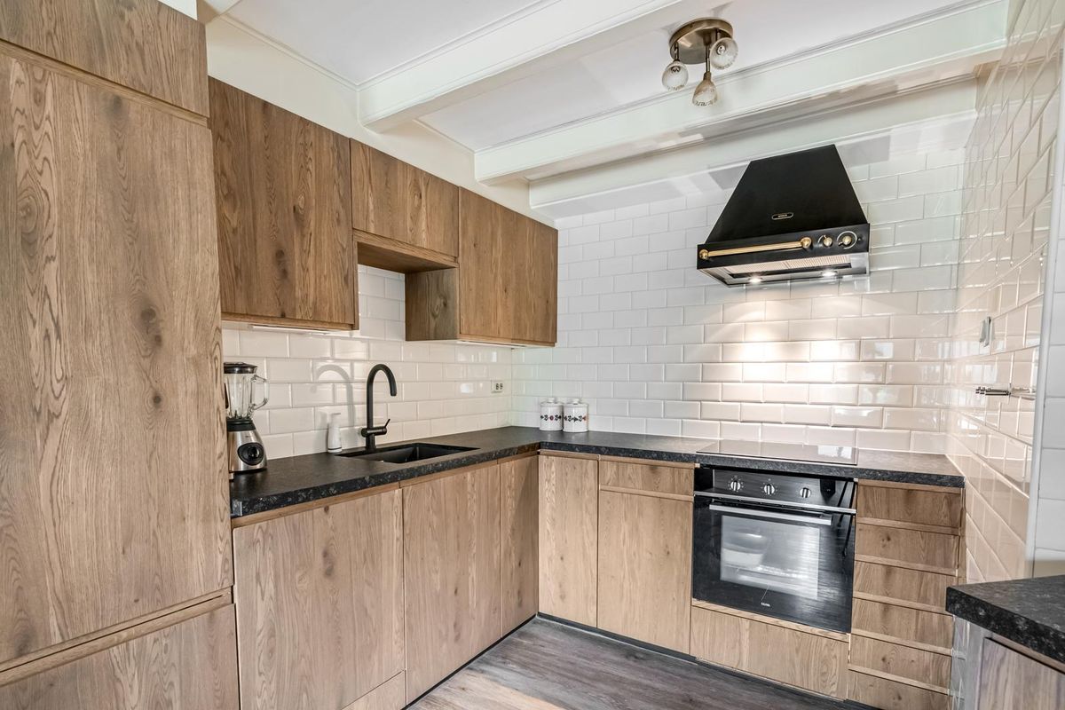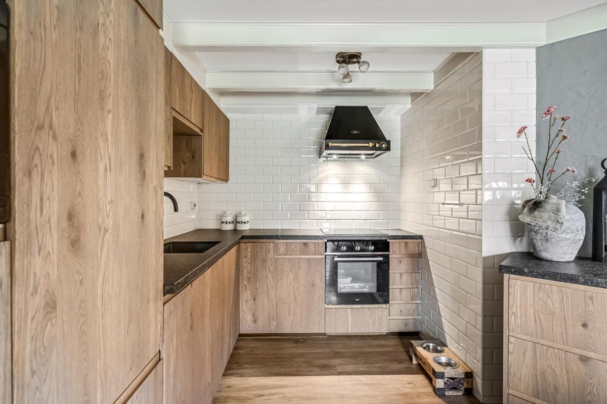 De doorloop naar de keuken onthult meteen hoe prachtig oud en nieuw in deze woning samenkomen. Zodra u de ruimte betreedt, wordt duidelijk dat hier met oog voor detail is gewerkt: de landelijke charme van vroeger is naadloos gecombineerd met het comfort en de strakheid van nu. De nieuwe keuken vormt het hart van het huis – een sfeervolle plek waar esthetiek en functionaliteit hand in hand gaan. De houtlook fronten brengen warmte en karakter, terwijl het donker stenen werkblad een stoer en stijlvol contrast biedt. Het greeploze design zorgt voor een moderne, rustige uitstraling.
