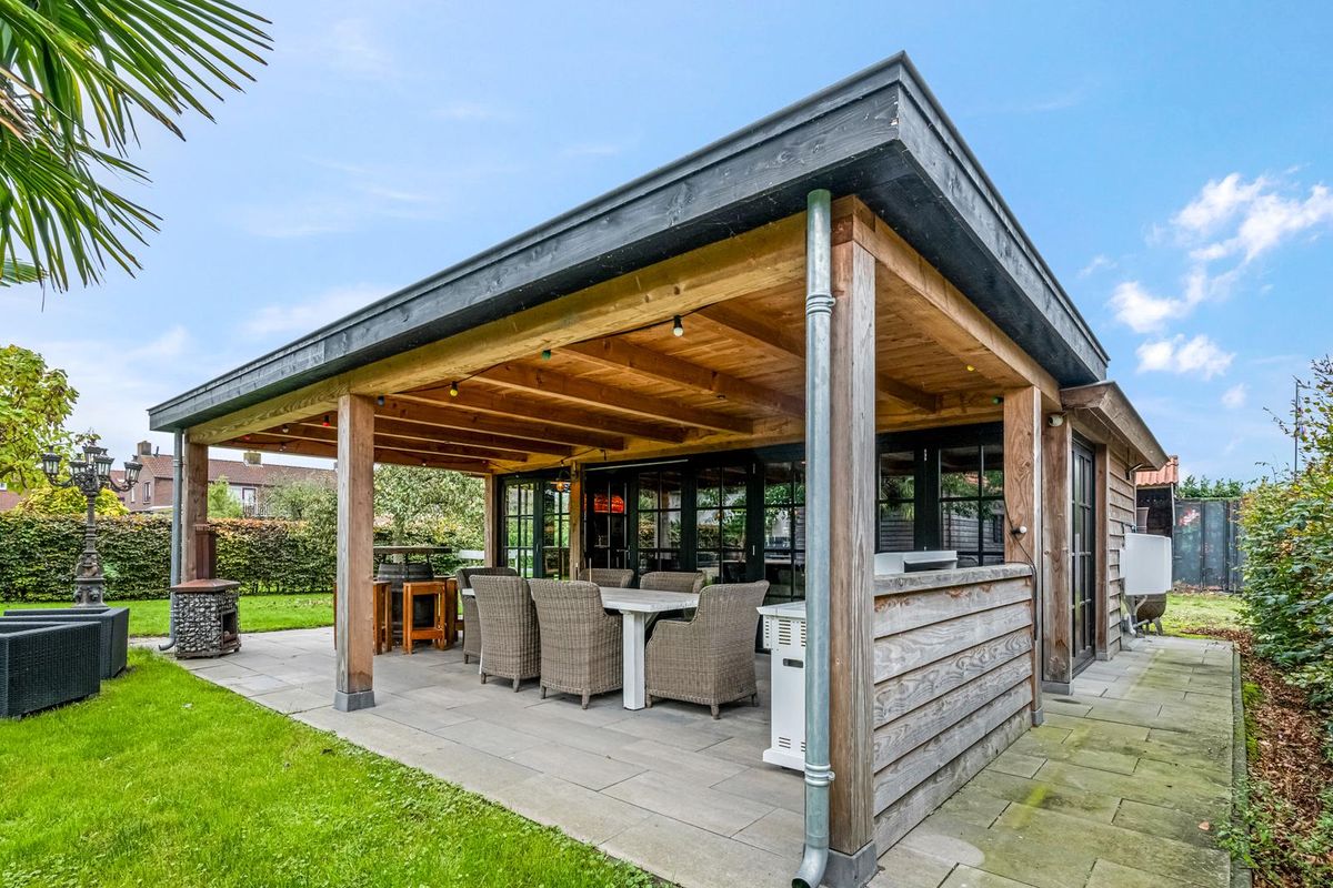 Tussen het groen zorgen palmbomen voor een vleugje mediterrane sfeer, terwijl tuinverlichting subtiel de contouren van het perceel benadrukt zodra de avond valt. Op meerdere plekken zijn waterpunten aangebracht, wat het onderhoud van de tuin gemakkelijk maakt en ruimte biedt voor creativiteit – of dat nu een vijver, een moestuin of bloementuin is. Midden op het perceel bevindt zich een grote houten schuur met pannendak, die zowel charmant als praktisch is. Deze ruimte biedt volop mogelijkheden: ideaal als opslag, hobbyruimte, of zelfs uw auto. De robuuste constructie en landelijke uitstraling passen perfect bij de natuurlijke omgeving. Deze elegante tuin bij de woning wordt compleet gemaakt door een prachtig bijgebouw waar zo meteen een welverdiende eigen alinea aan wordt gewijd.