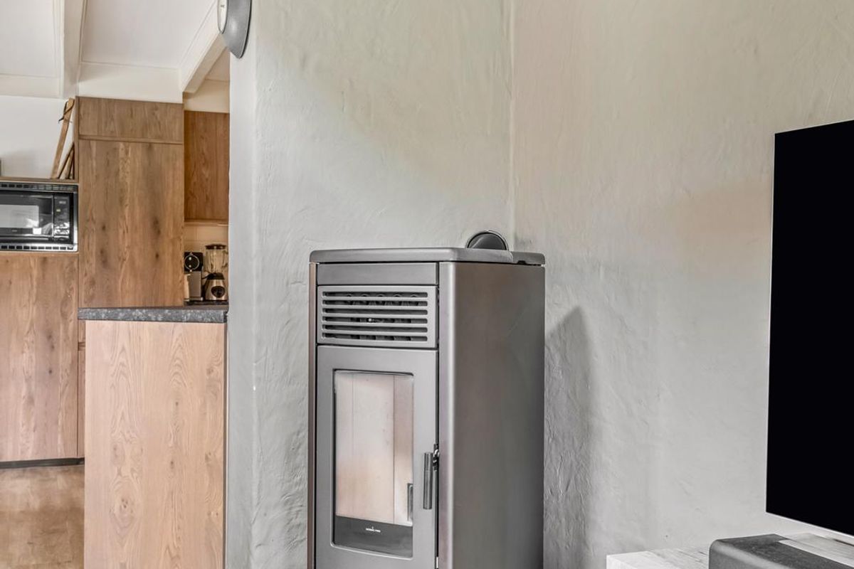 Een pellet kachel zorgt voor een behaaglijke warmte op koelere dagen en geeft de ruimte een knusse, huiselijke sfeer. Voor de warme zomerdagen is er een airco aanwezig, zodat het hier altijd aangenaam vertoeven is. De vloertegels dragen bij aan de praktische, onderhoudsvriendelijke afwerking, terwijl het prachtige balkwerk en het pannendak het bijgebouw een charmante landelijke uitstraling geven.