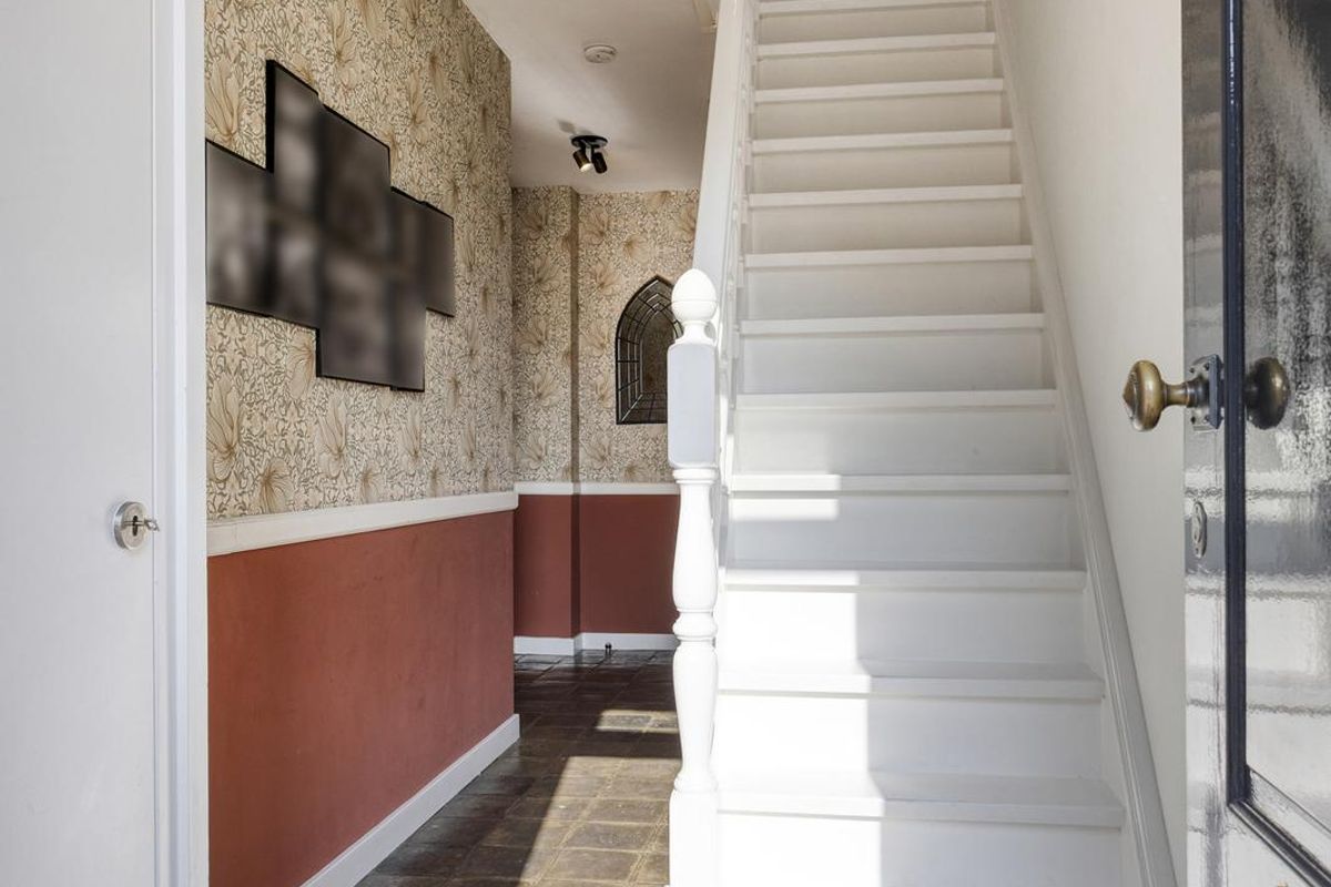 * Entree, hal voorzien van plavuizen vloer, prachtige trapopgang naar de verdieping, garderobe en volledig betegeld modern zwevend toilet met fonteintje.