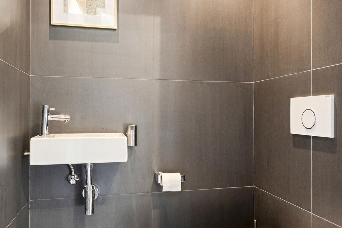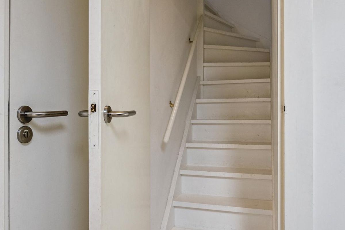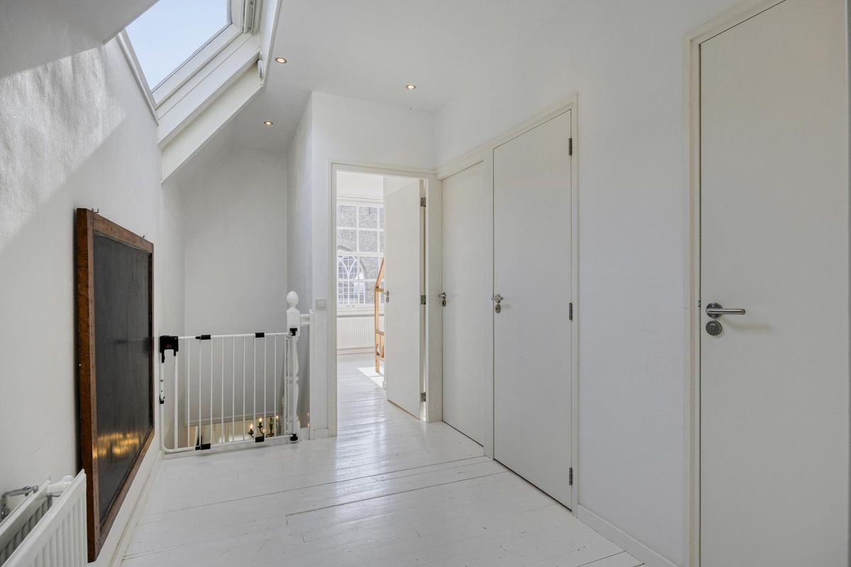 * Overloop voorzien van houten vloer, dakraam, trapopgang naar de 2e verdieping en volledig betegeld modern zwevend toilet.