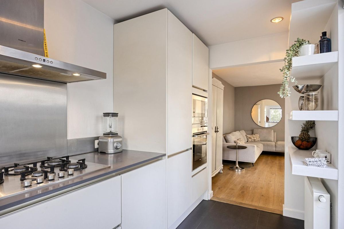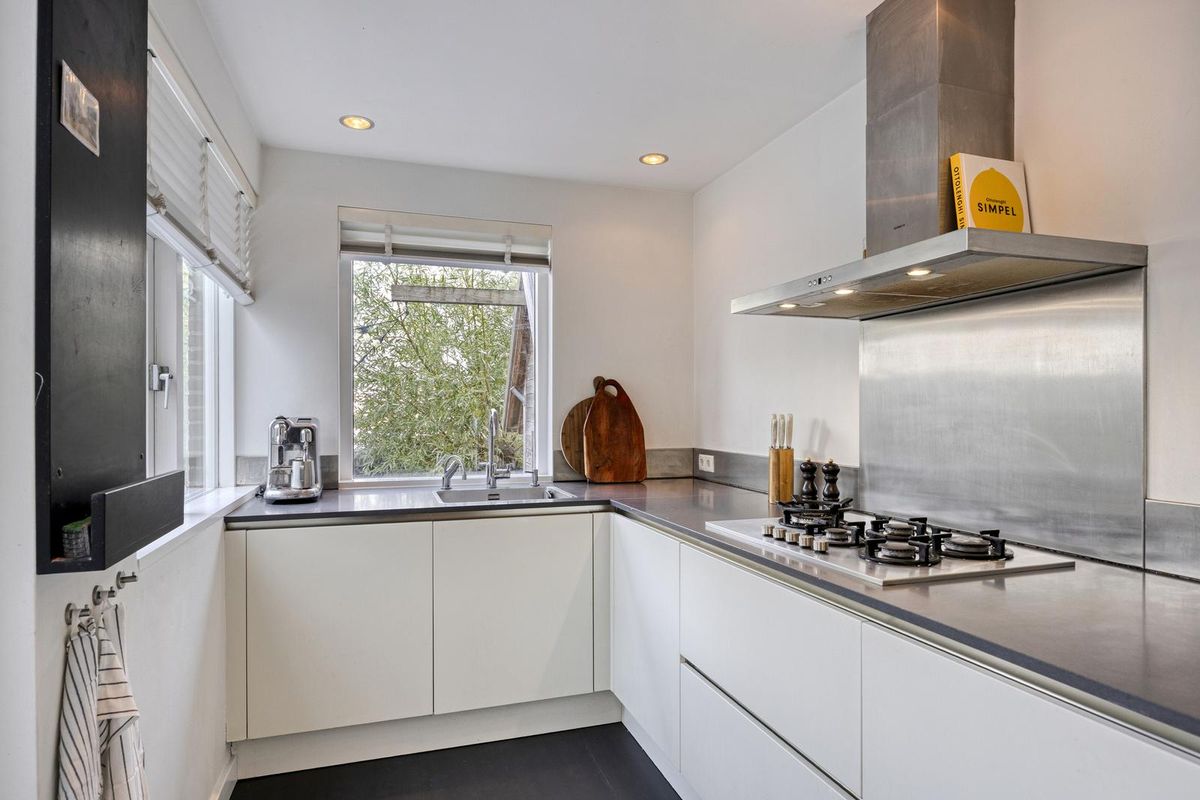 * Luxe moderne keuken van ca. 8 m2 voorzien van plavuizen vloer, 5-pits gaskookplaat, RVS afzuigkap, Quooker, combi-oven, koel-/vrieskast en vaatwasser (2022).