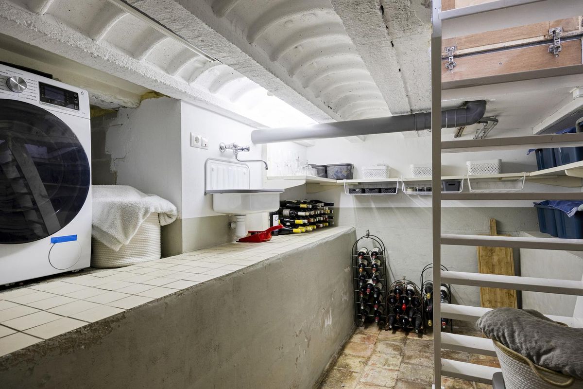 * De wijnkelder van ca. 12 m2 is bereikbaar middels een verborgen luik in de vloer waar ook de aansluiting voor de wasmachine/droger is.