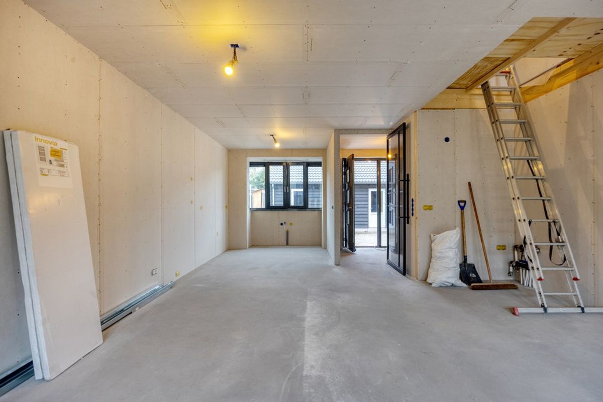 Indeling begane grond: Hal met meterkast, toiletruimte, taatsdeur naar grote living, openslaande deuren naar achtertuin, open keuken aan voorzijde woning. (Keuken, toilet, vloeren en wandafwerking middels stelplaatsen te realiseren door aannemer).