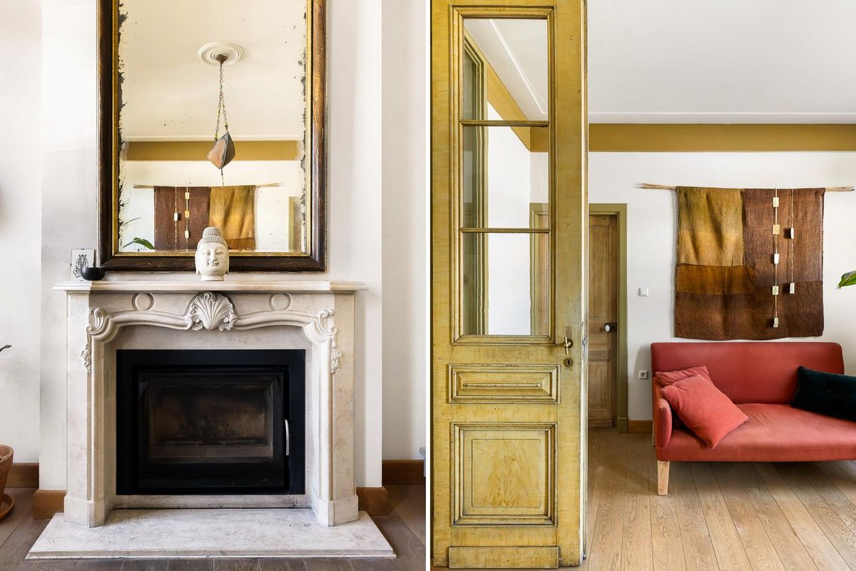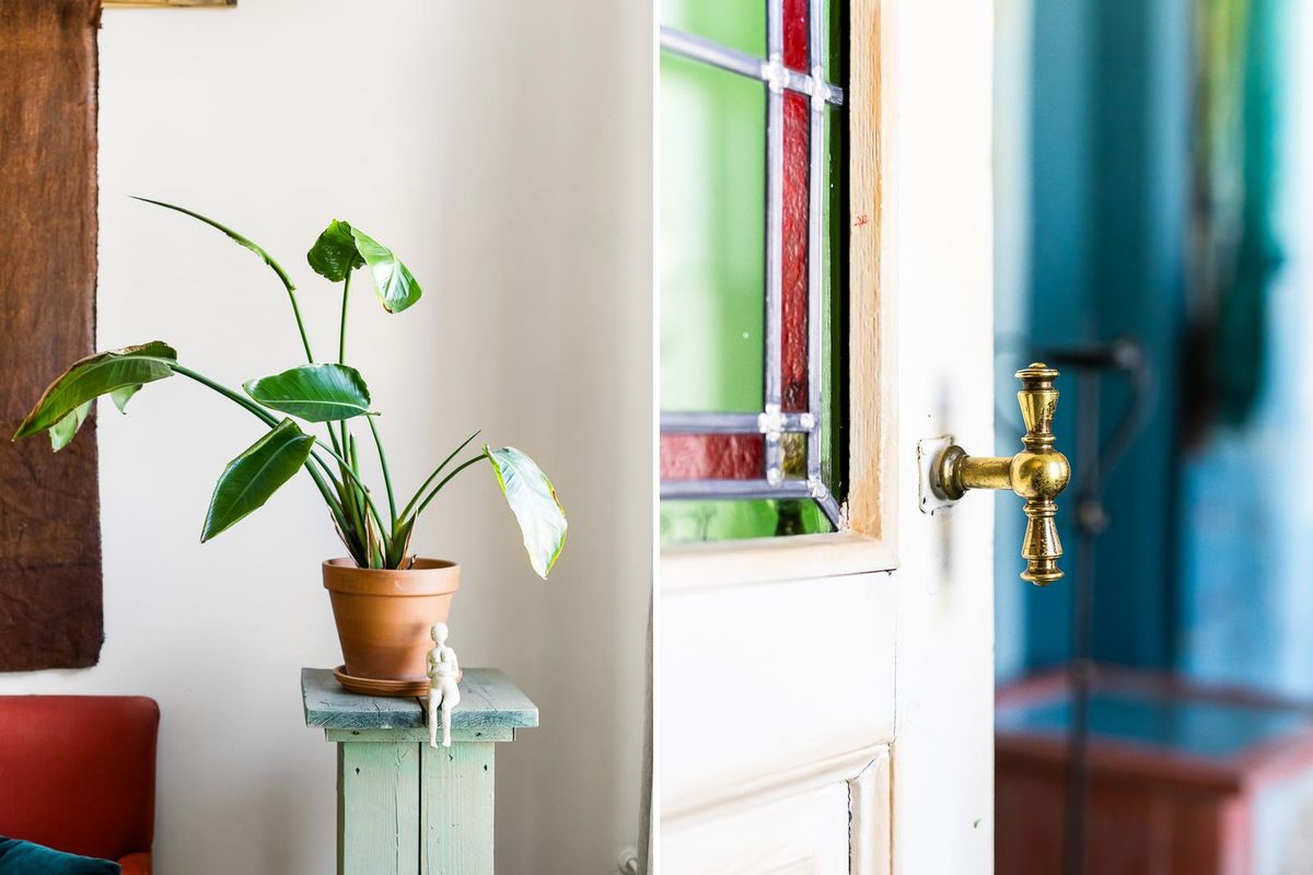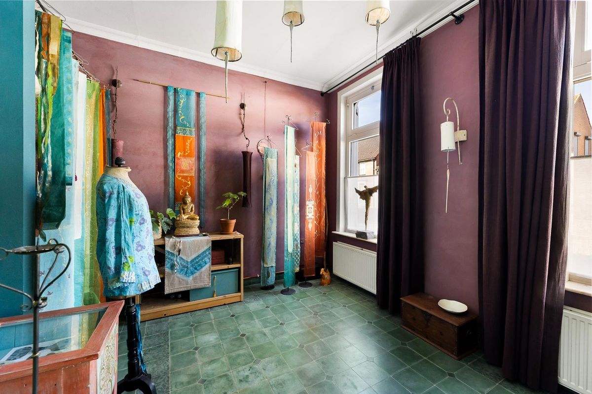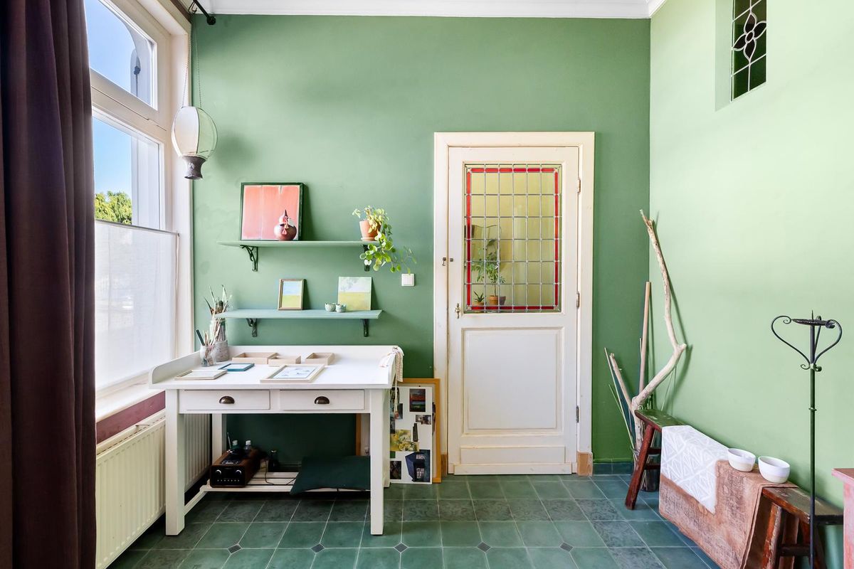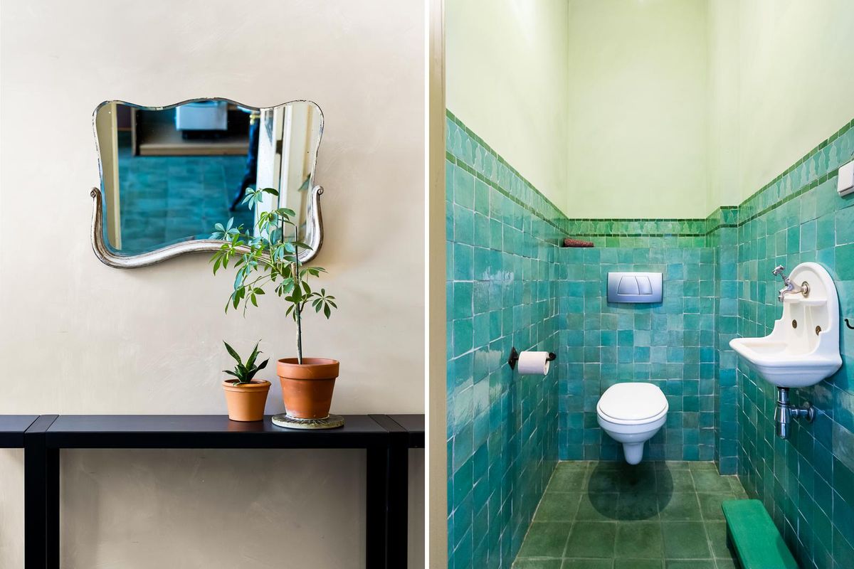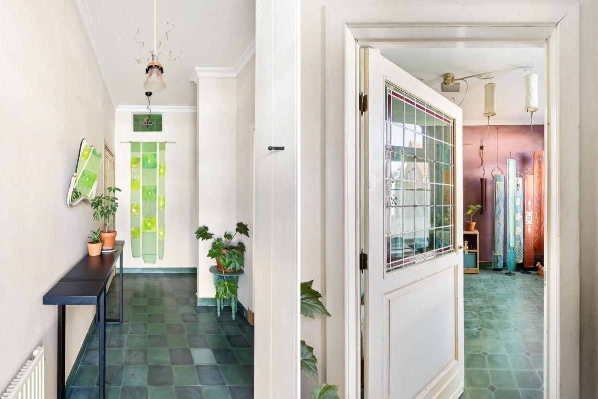 De hoge plafonds in de entree geven direct een ruimtelijk gevoel, terwijl het unieke tegelwerk in de gang een bijzonder detail vormt. Hier bevinden zich de meterkast, toegang tot de atelier/slaapkamer op de begane grond, toilet, en de leefruimtes.