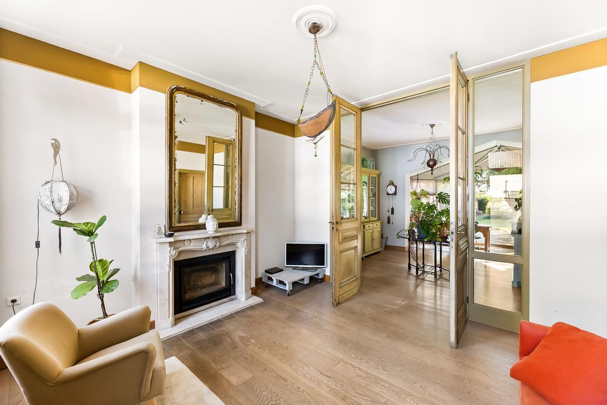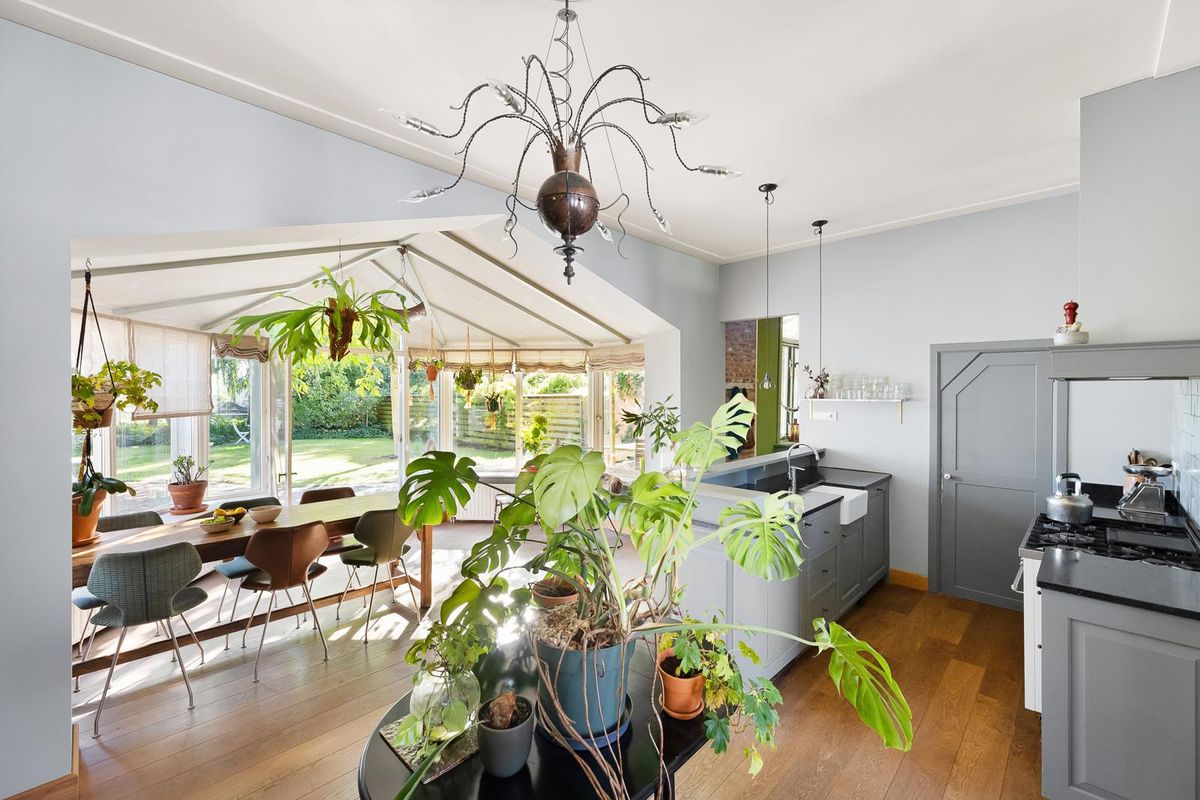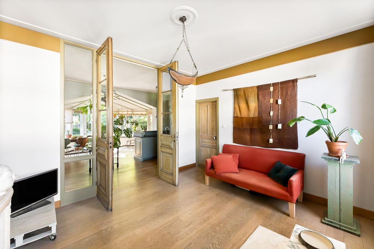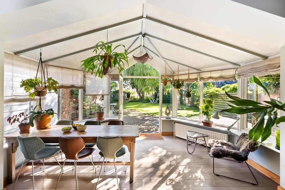 Aan de achterzijde bevindt zich de lichte tuinkamer, met openslaande deuren naar de tuin.