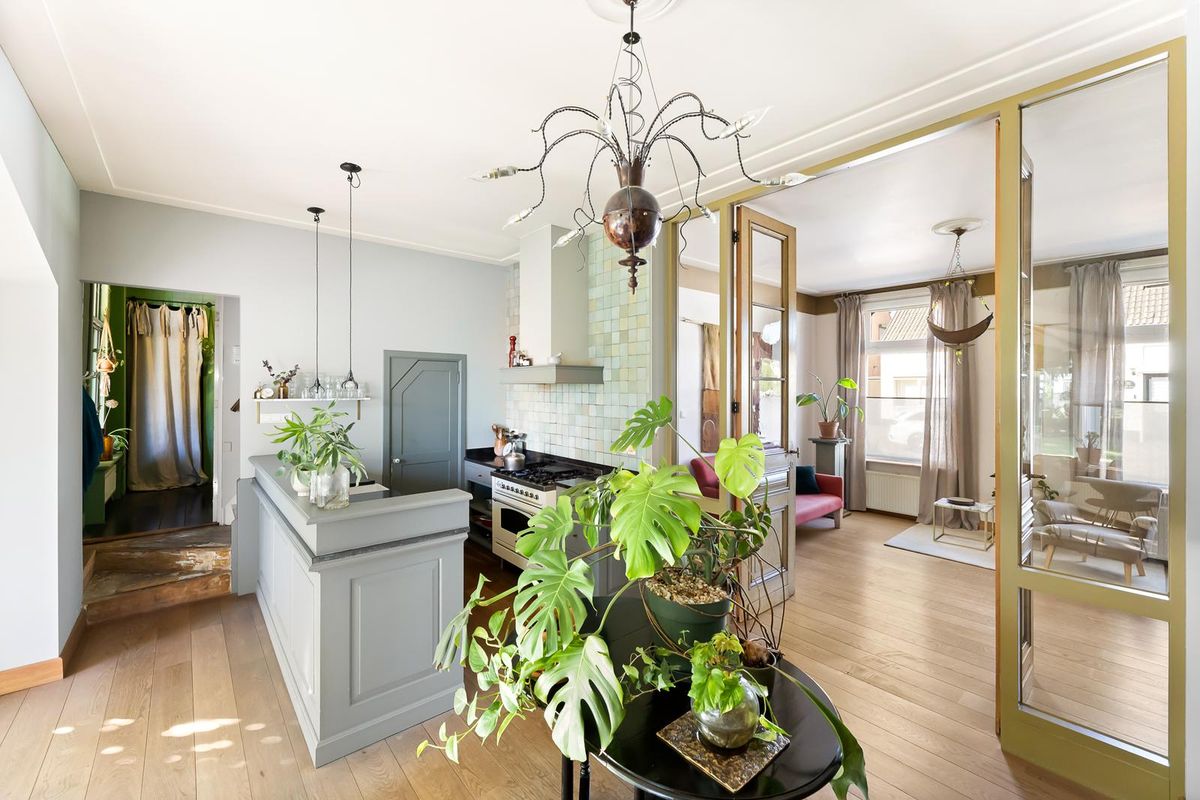 Via de karakteristieke hoge massief houten deuren bereik je de keuken, waar de houten vloer en de zelliges wandtegels naadloos aansluiten bij de stijl van de woning.