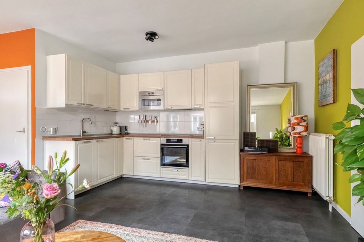 De open keuken is voorzien van een praktische opstelling met voldoende werk- en bergruimte.