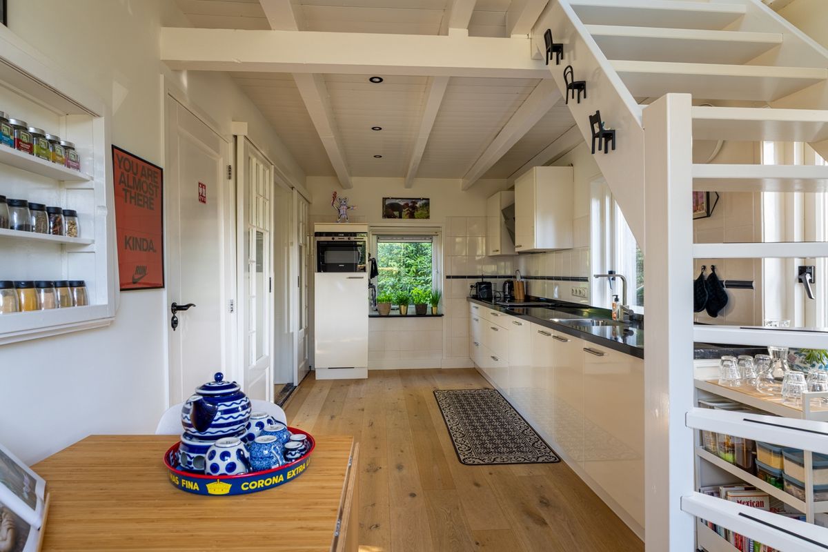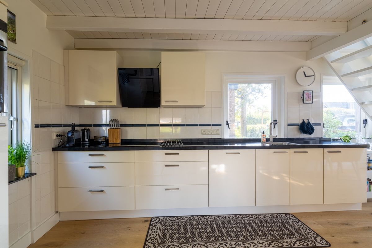 De woonkeuken is echt een fijne plek waar koken en gezelligheid samenkomen. De keuken is strak en praktisch ingericht met een inductiekookplaat, design afzuigkap, combioven, koelkast, vaatwasser én een mooi stenen werkblad. Via een vaste trap ga je vanuit de keuken naar boven, en via een portaal ook zo naar het souterrain. Handig toch?
