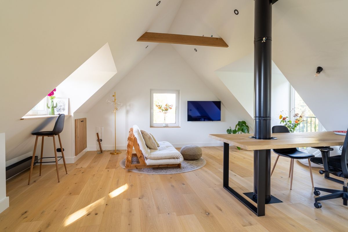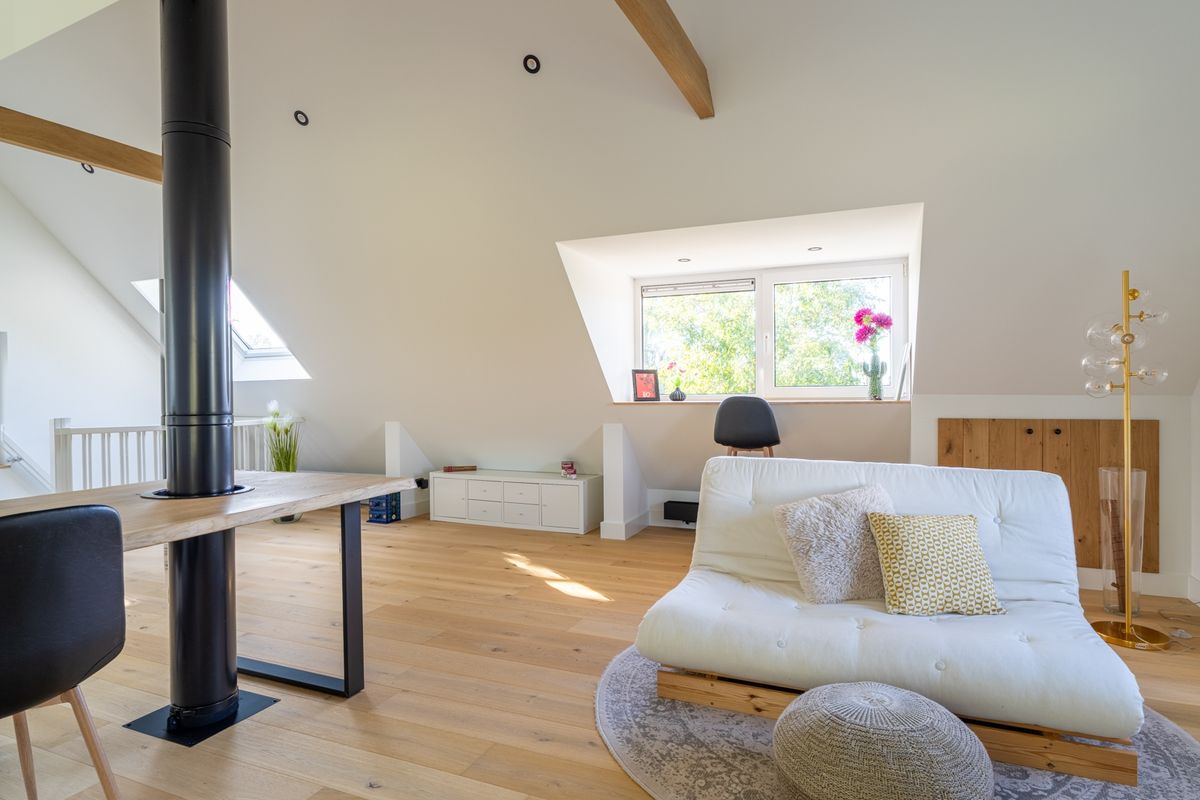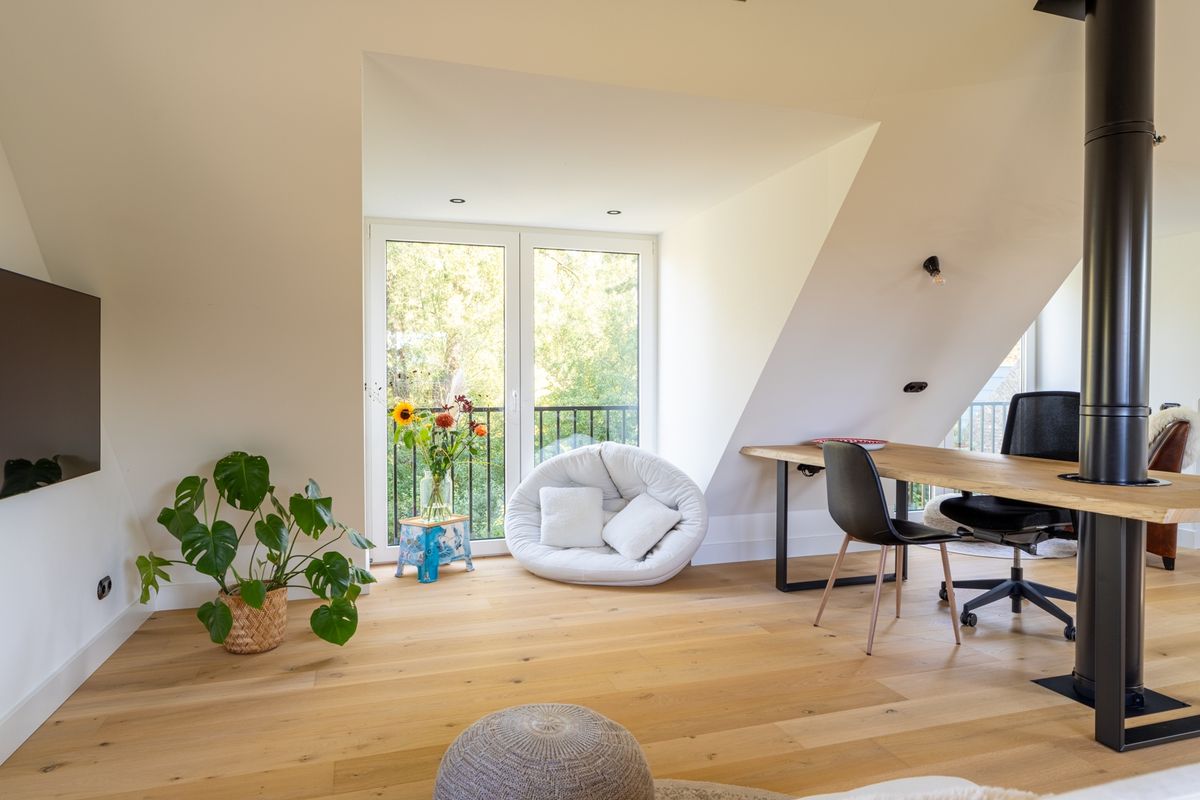 Waar wil je slapen? Je kunt kiezen! In het souterrain vind je een koel, rustig slaapvertrek met een vrijstaand ligbad en openslaande deuren naar buiten. Luxe en stijlvol. De badkamer is praktisch ingedeeld met een inloopdouche, wastafel, tweede toilet en handige kastruimte. De bovenverdieping is nu één grote, lichte ruimte met dakkapellen, ramen in de zijgevel én twee Franse balkons. Superlicht en ruimtelijk — en je maakt hier in een handomdraai één of twee fijne slaapkamers van.