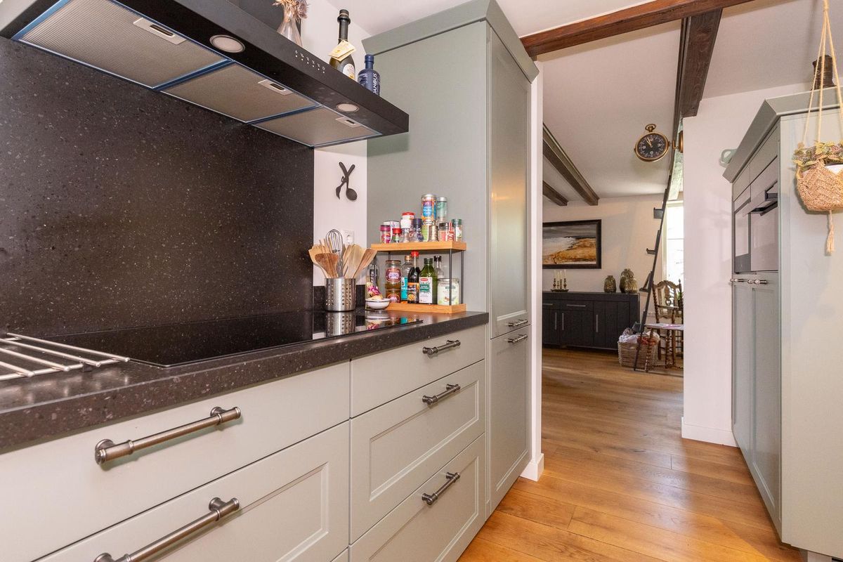 Bij binnenkomst in de woning wordt u omarmt door de fijne sfeer, de sfeer wordt verstrekt door het balkenplafond, de frans eiken vloer en de spiksplinternieuwe houtkachel. Via de hal met toilet en trapopgang komt u binnen in de woonkamer met via ensuite deuren toegang tot de serre. Zittend in de serre kijkt u op uw eigen mooi aangelegde tuin. Vanuit de woonkamer komt u in de half open keuken. De keuken is voorzien van diverse inbouwapparatuur zoals combi oven/magnetron, vaatwasser, koel/vries combinatie, wijnkoeler en XL inductiekookplaat.