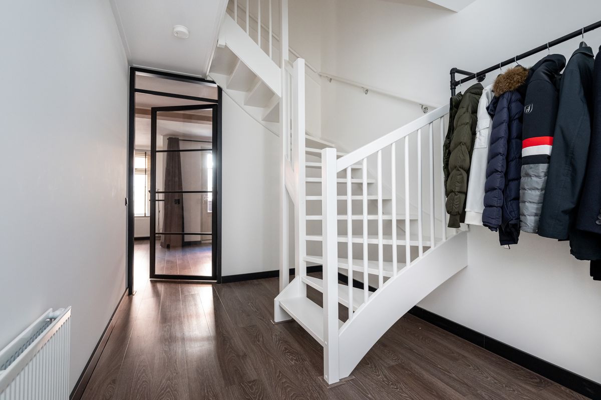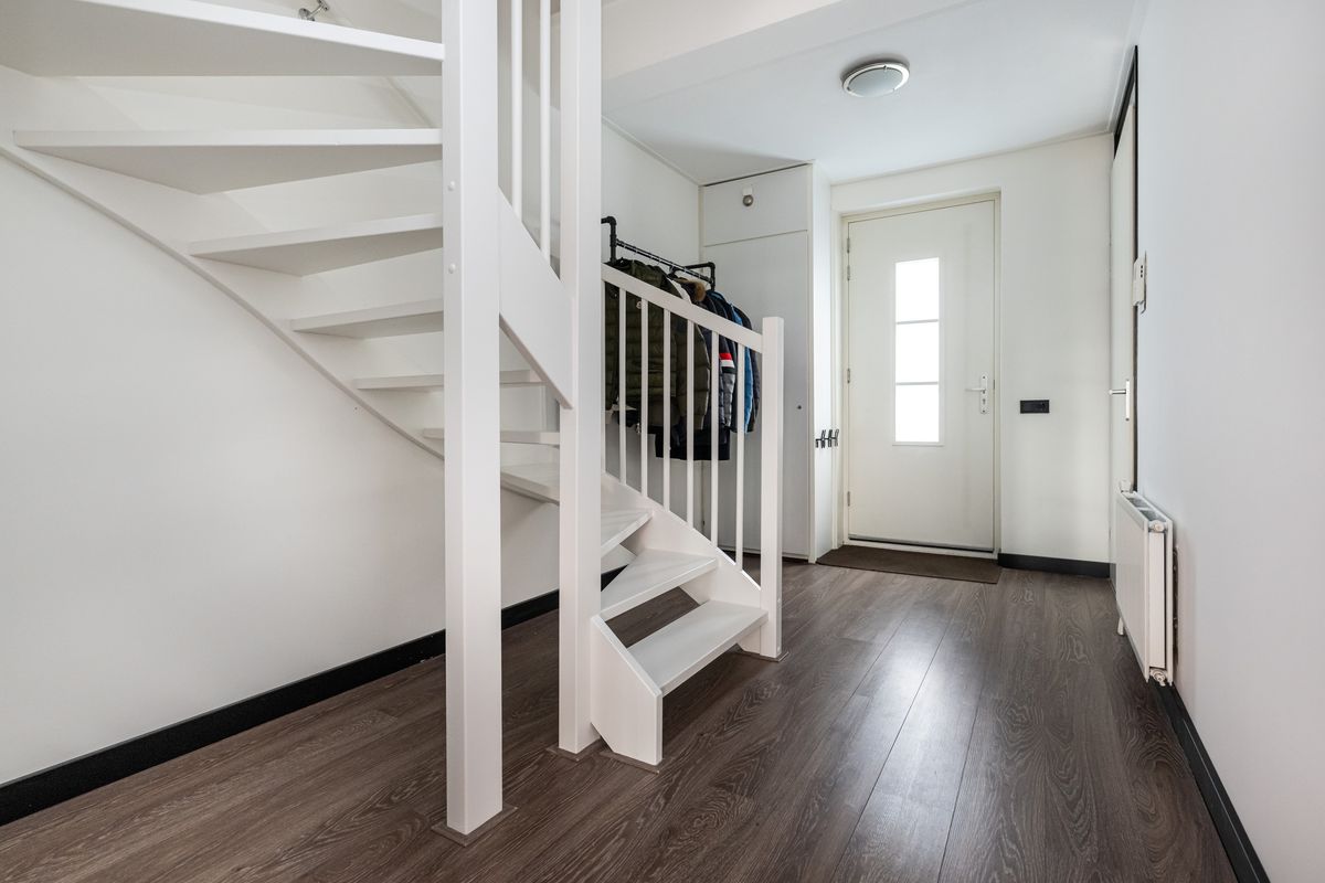 Laminaatvloer, radiator, meterkast en trapopgang.