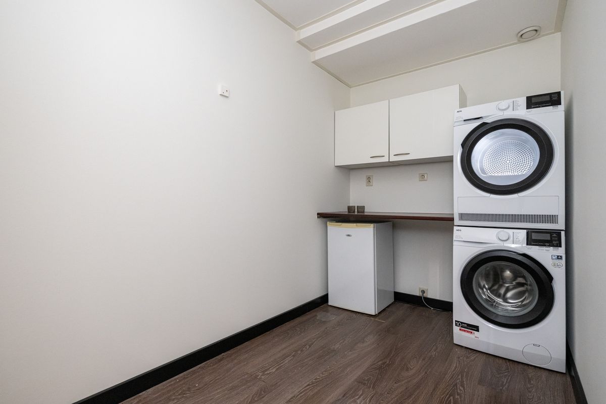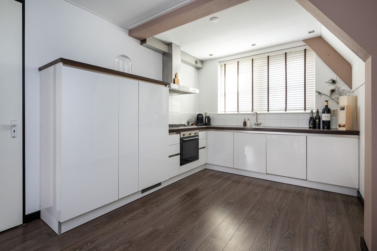 De moderne, open hoogglans witte keuken is voorzien van greeploze soft-close kastjes en uitgerust met diverse inbouwapparatuur: een koelkast, oven, vaatwasser en een 4-pits gasfornuis met afzuigkap. De keuken is stijlvol afgewerkt en verlicht met inbouwspotjes, wat zorgt voor een luxe uitstraling. Direct naast de keuken bevindt zich een ruime bijkeuken met witgoedaansluitingen, ideaal voor extra opbergruimte of het plaatsen van uw wasmachine en droger.