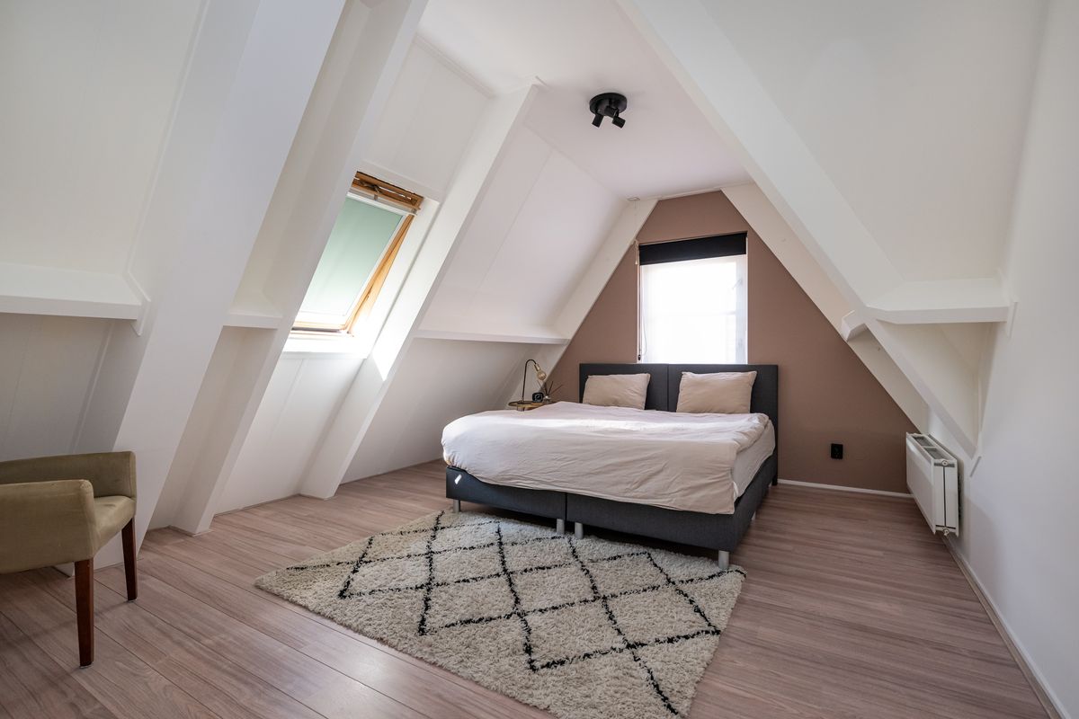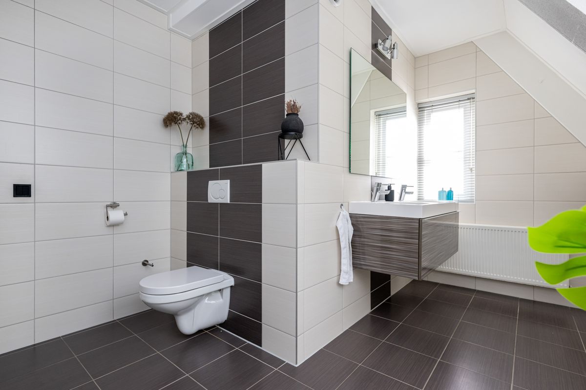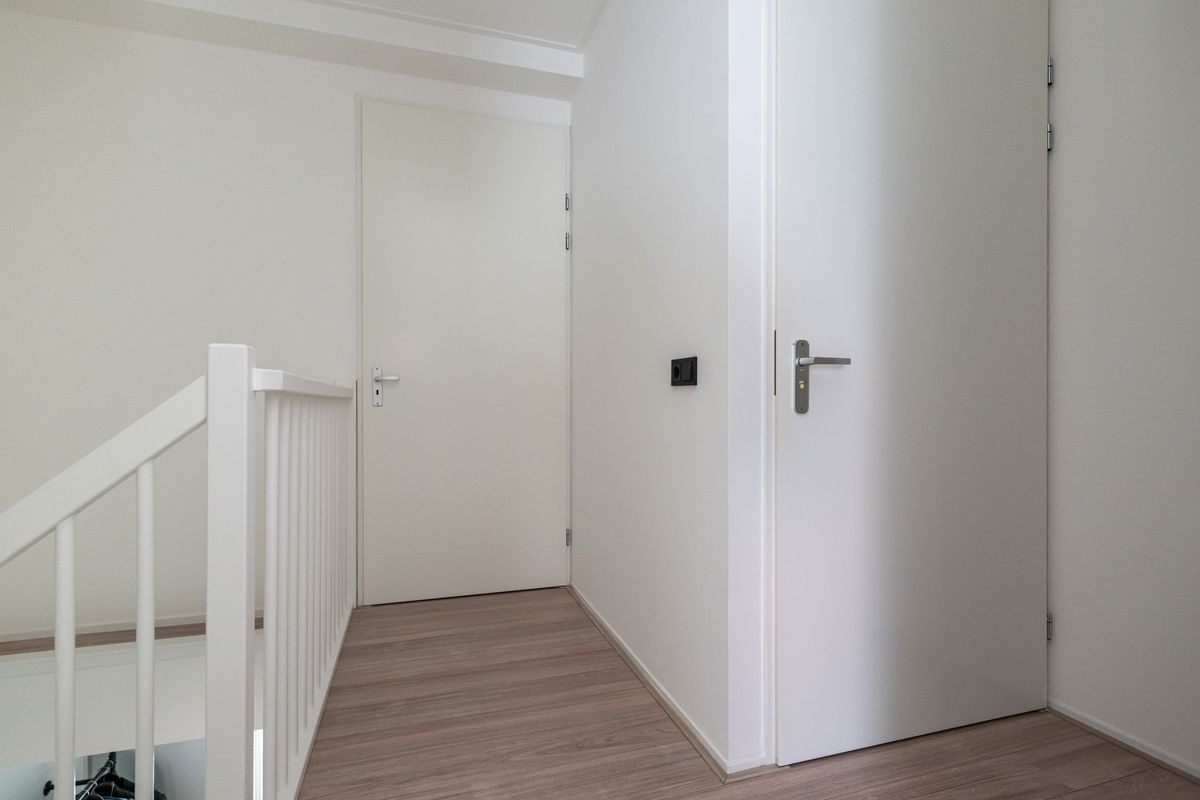 In de entreehal leidt een vaste trapopgang naar de bovenverdieping. Hier treft u twee slaapkamers, een luxe badkamer en een berging. De hoofdslaapkamer is royaal van formaat, voorzien van een vaste kastenwand, inbouwspotjes en een Velux dakraam dat zorgt voor veel daglicht. De tweede slaapkamer is compacter, maar eveneens licht en voorzien van een Velux dakraam. De badkamer is een echte eyecatcher: strak afgewerkt, ruim en speels ingedeeld. U beschikt hier over een hangend toilet, een dubbel wastafelmeubel en een riante inloopdouche. Aan de overzijde van de overloop vindt u nog een praktische berging.