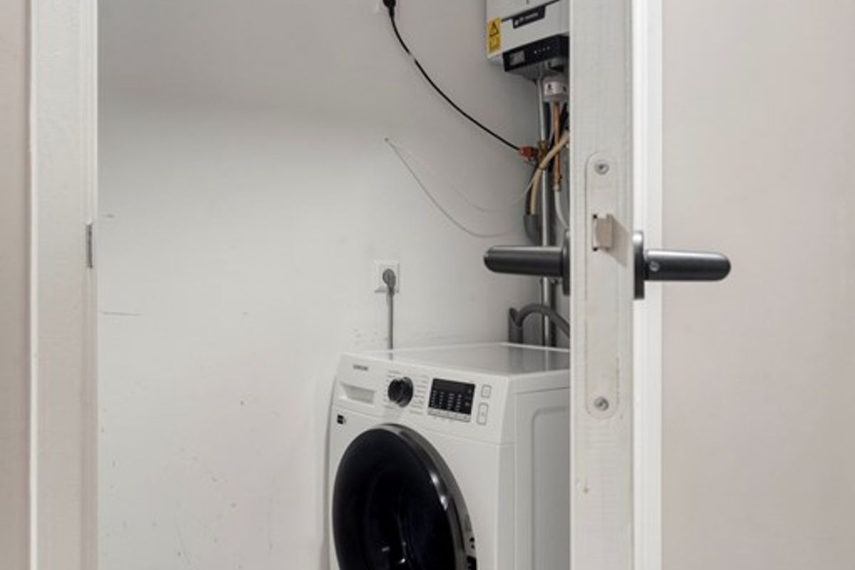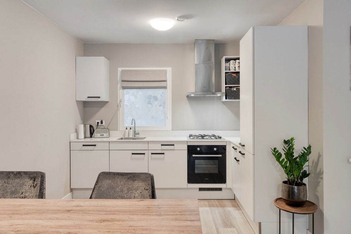De moderne keuken is voorzien diverse inbouwapparatuur zoals een 4-pitsgasstel, afzuigkap, vaatwasser, oven en een koelkast.