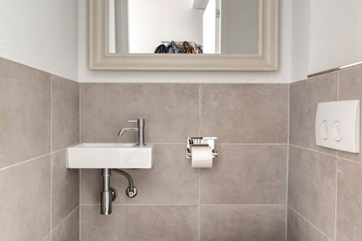 De luxe geheel betegelde badkamer uitgevoerd met ligbad, inloopdouche, wastafelmeubel en designradiator.