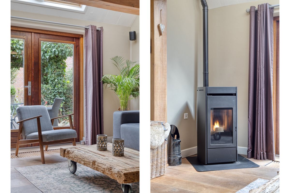 • Ruime woonkamer met houtkachel, palletkachel, vloerverwarming, airco en openslaande deuren