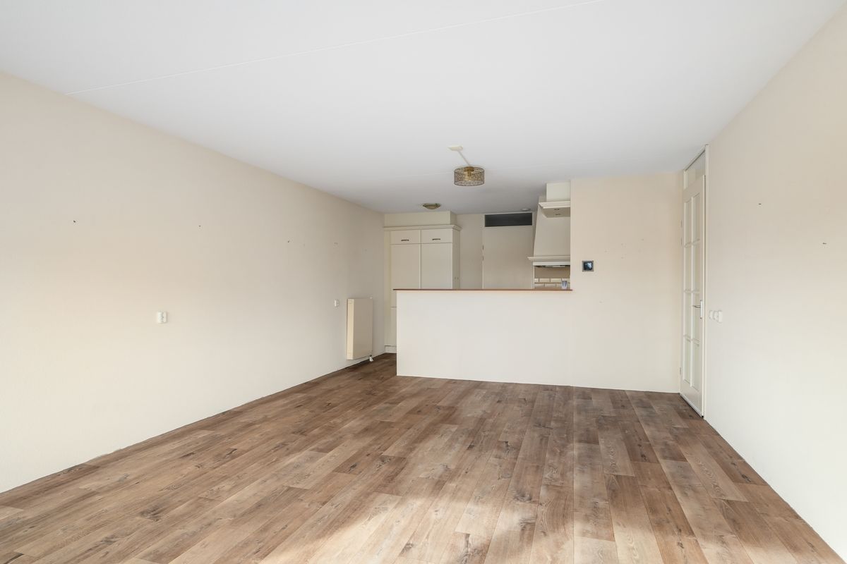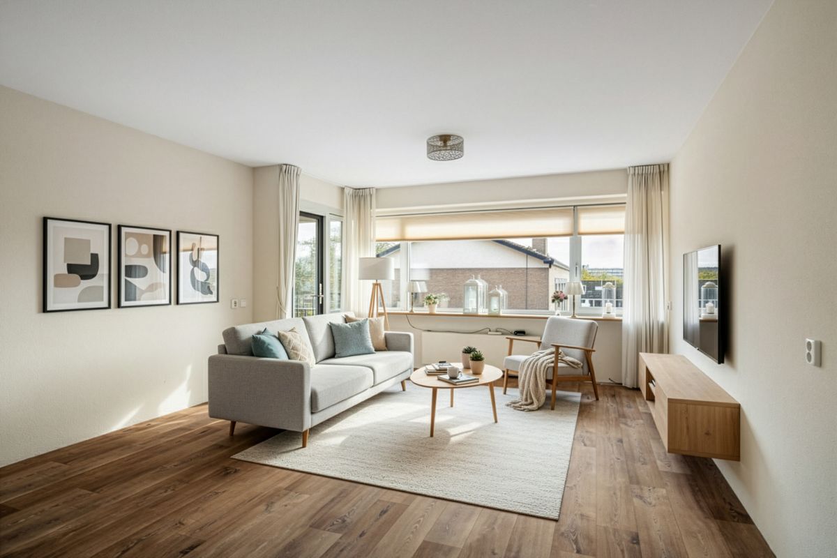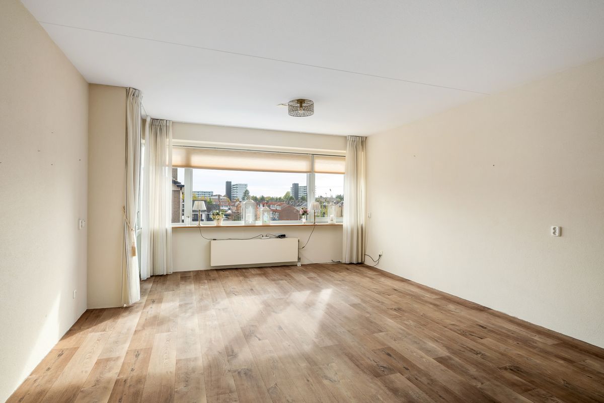 Gezellige woonkamer (ca. 7.04 x 4.59m) met fijne lichtinval en leuk uitzicht over de wijk Dorrestein, de Boslaan en de Prins Mauritssingel. Deur naar balkon.