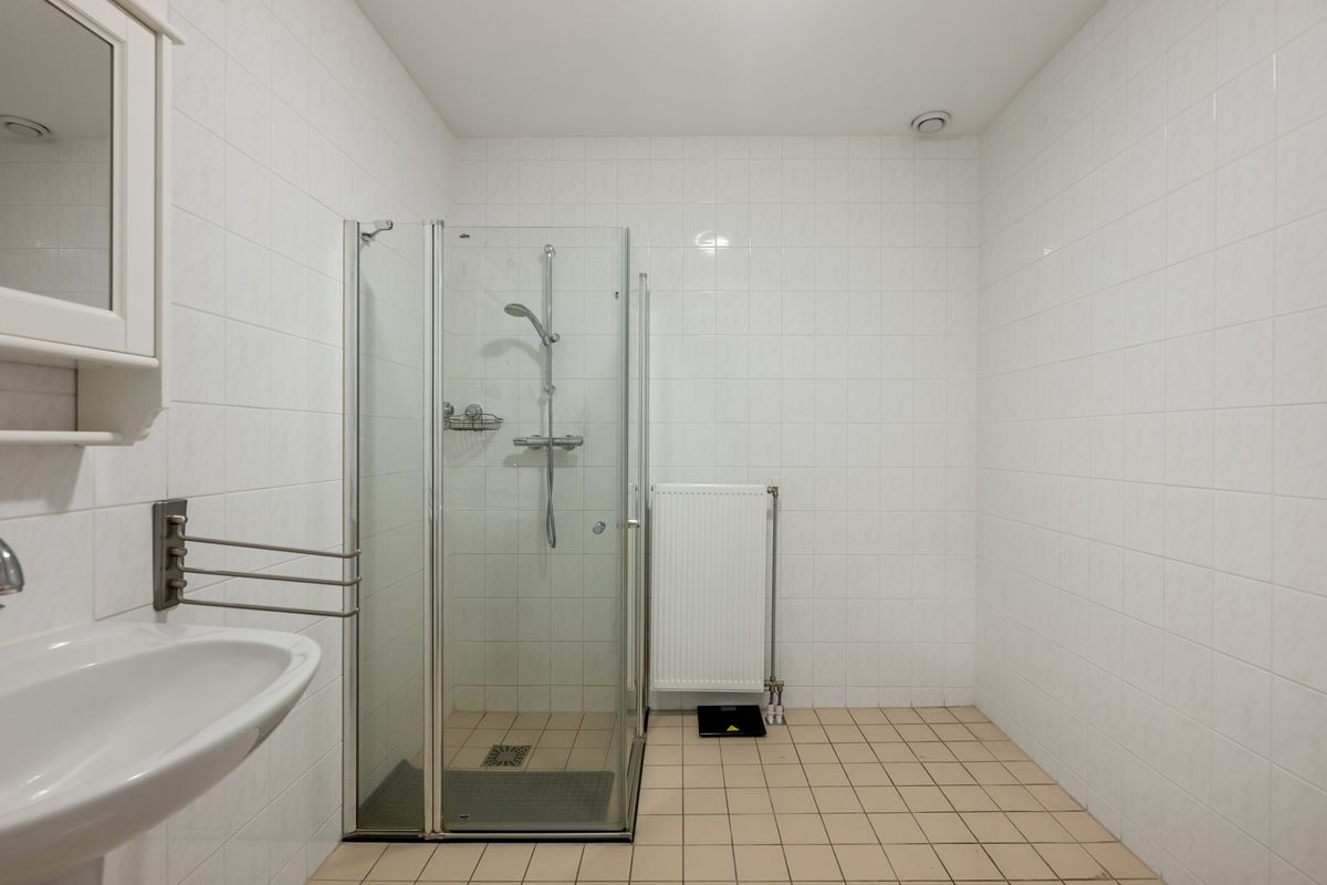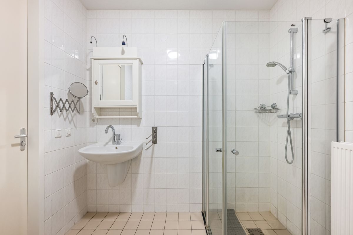 Verzorgde en ruime badkamer met douchecabine en wastafel.