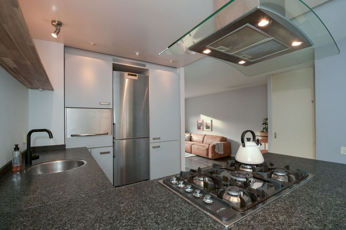 De keuken met schiereiland en veel opbergruimte beschikt over diverse inbouwapparatuur, waaronder; 6-pits gasfornuis, koel-vries combinatie, afzuigkap en een vaatwasser.