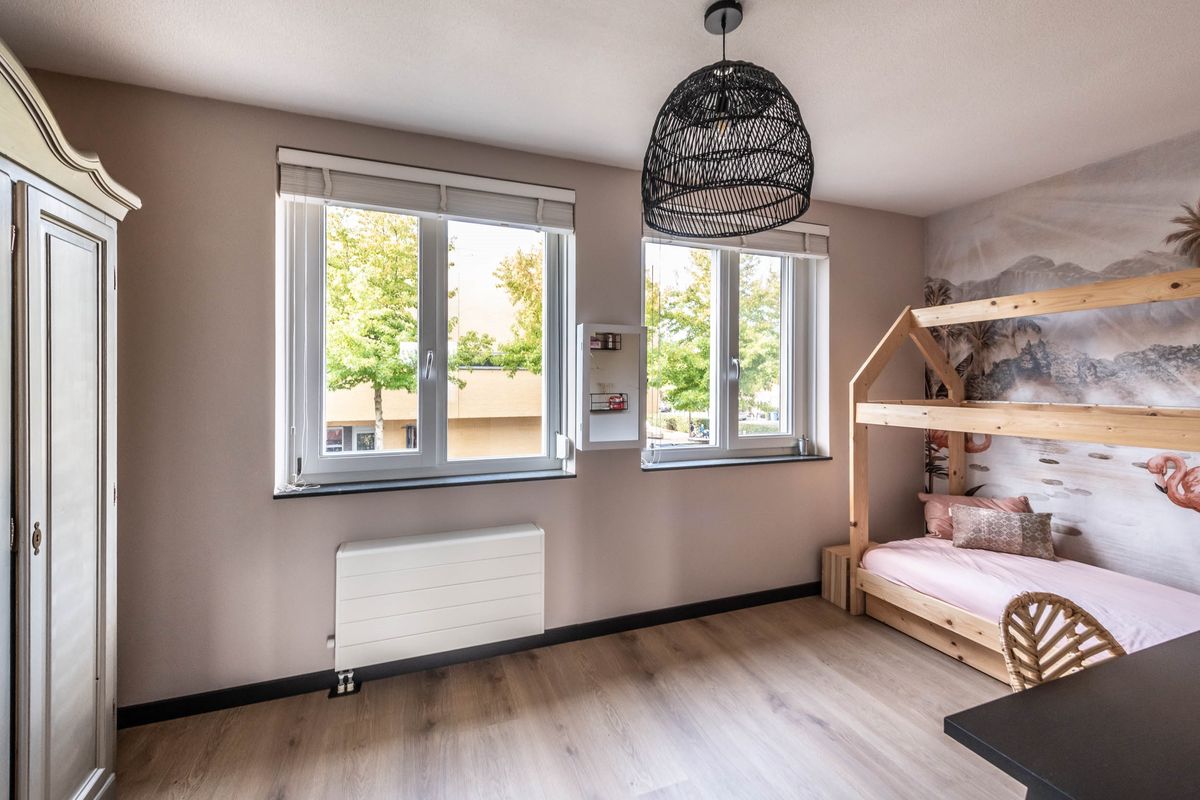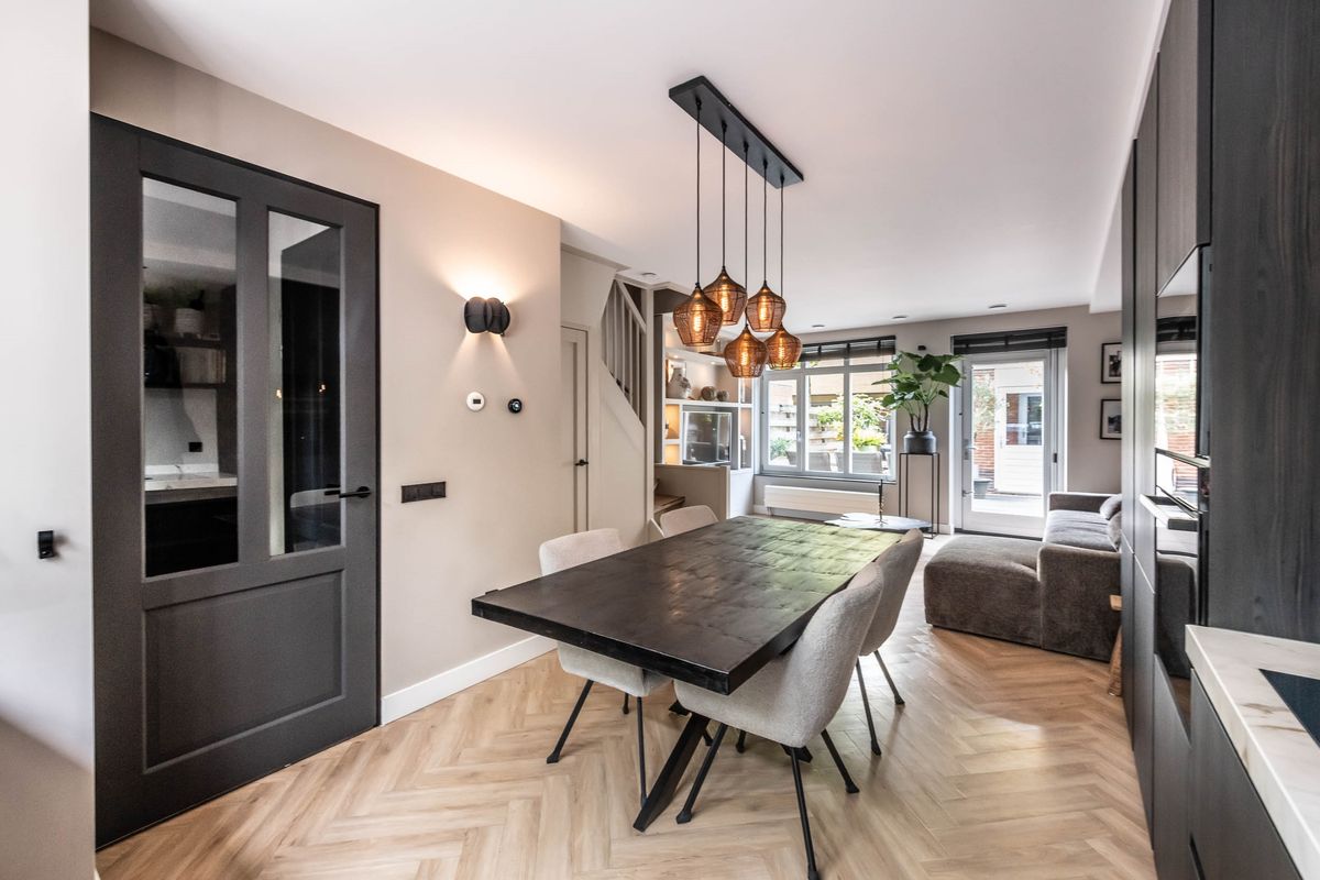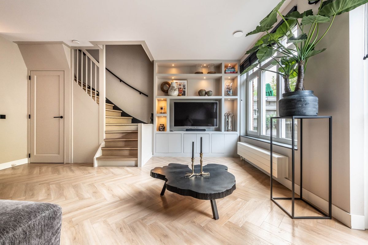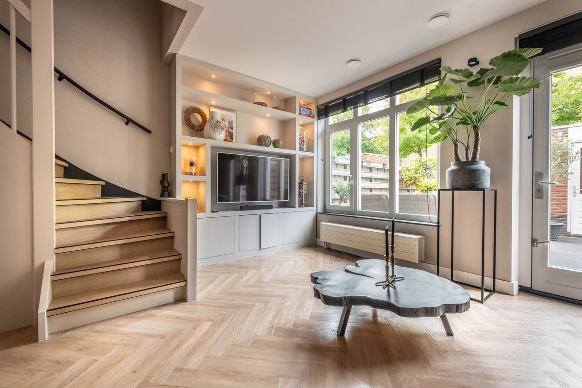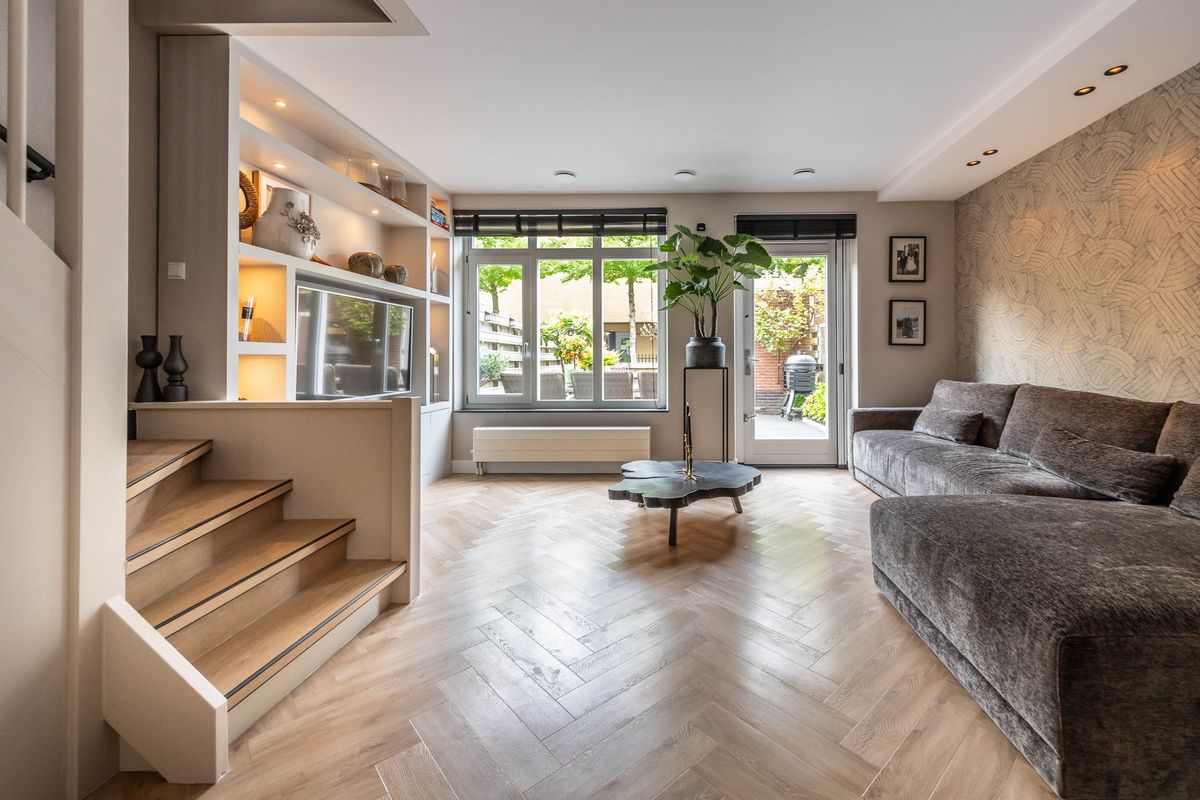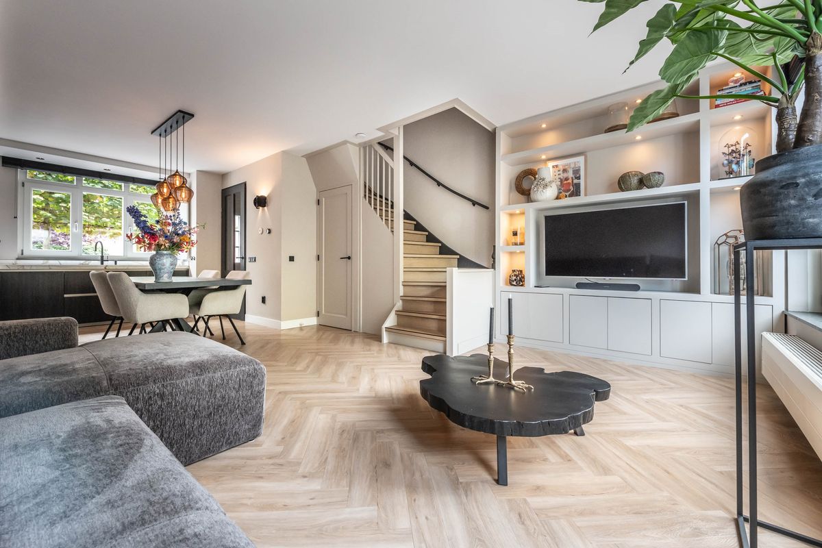 De gehele begane grond is voorzien van een pvc-vloer in visgraatmotief, wat de woning een moderne en chique uitstraling geeft. De lichte en tuingerichte woonkamer met maatwerk kastenwand biedt een zee van daglicht, dankzij de grote ramen aan de achterzijde.