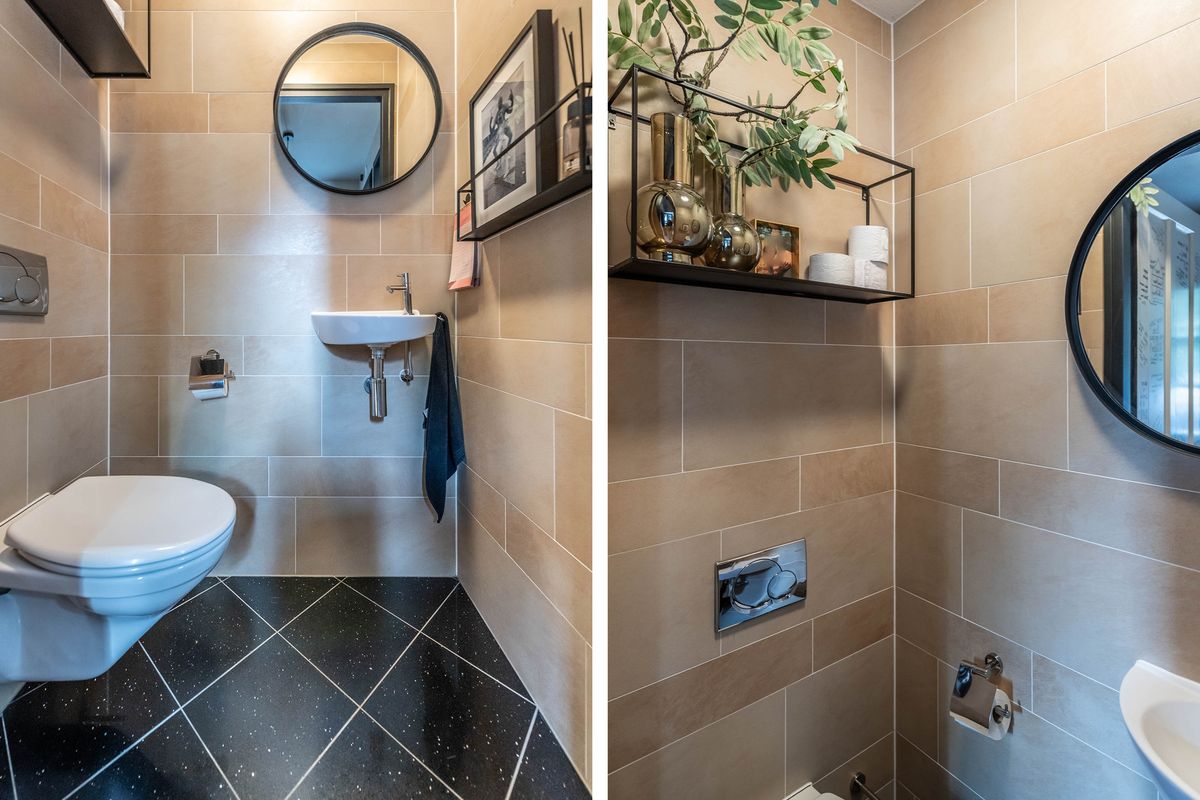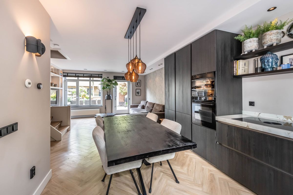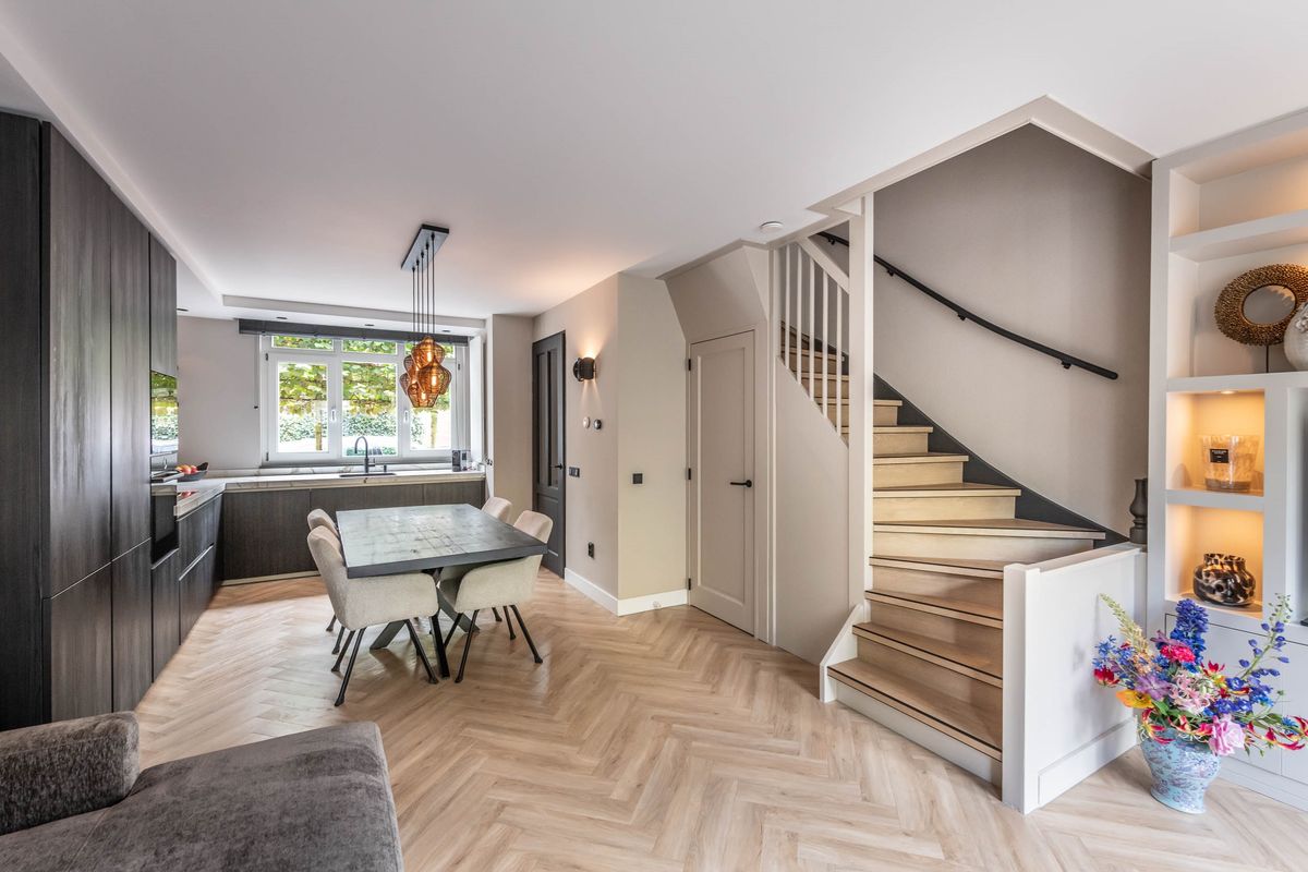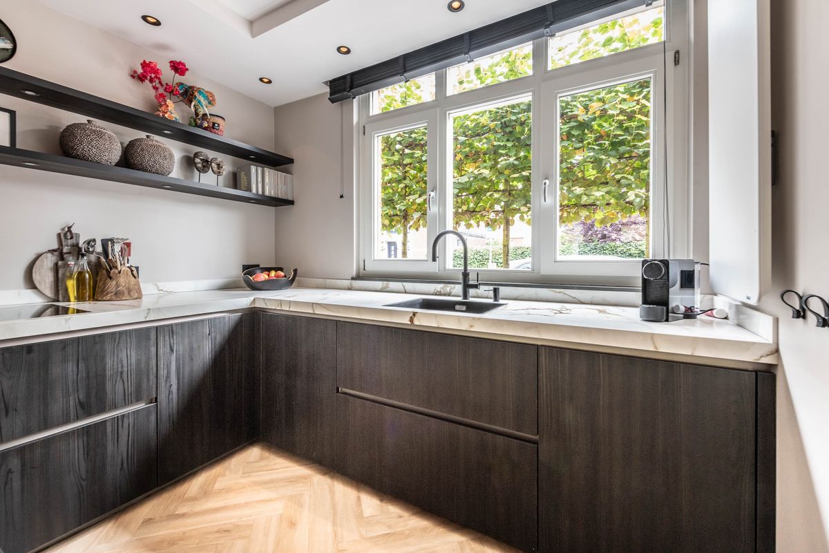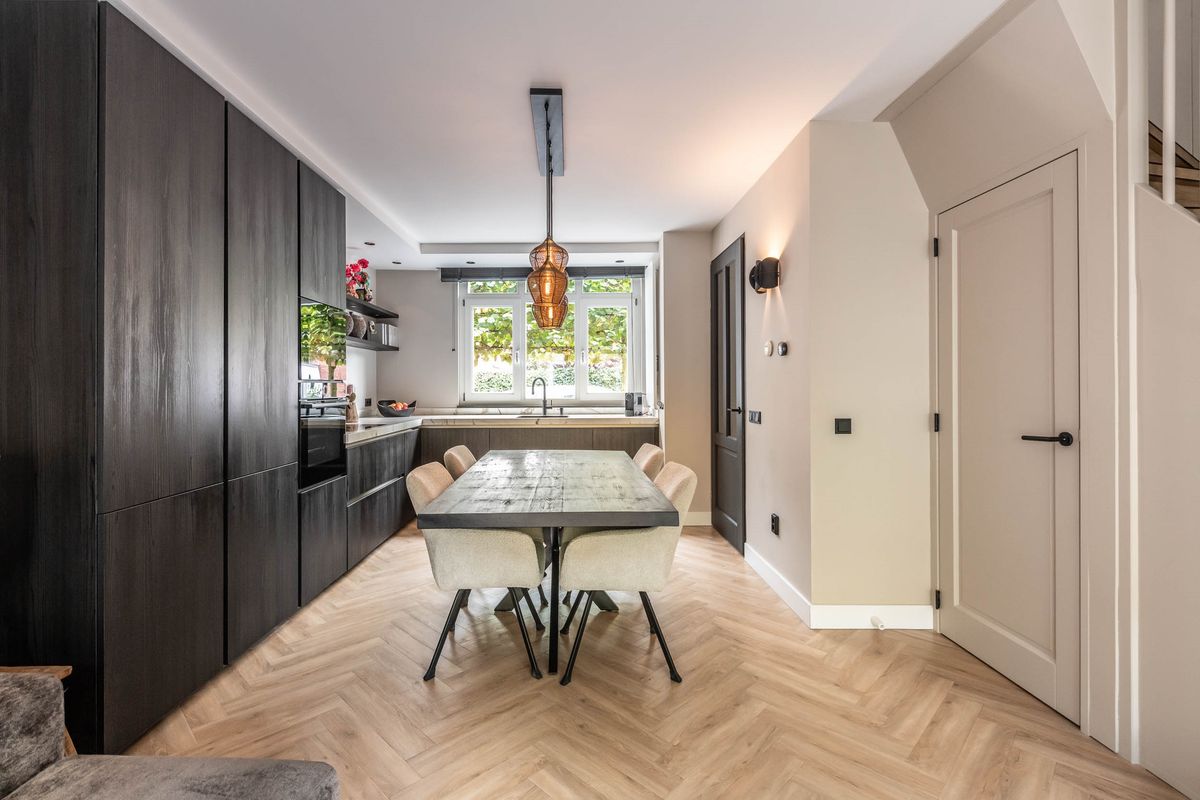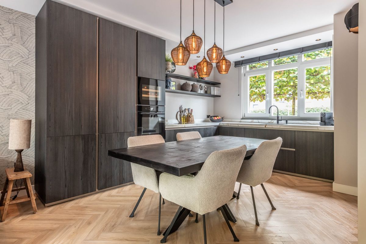 Aan de voorzijde van de woning bevindt zich de keuken, vernieuwd in 2021. Deze is uitgerust met hoogwaardige inbouwapparatuur, waaronder een inductiekookplaat met geïntegreerde afzuiging, een oven, een koelkast, een vriezer, een vaatwasser, een quooker en een wijnklimaatkast. De kasten en lades bieden ruim voldoende opbergruimte en het strakke werkblad maakt de keuken zowel stijlvol als praktisch. Hier is het heerlijk kokkerellen voor familie en/of vrienden.